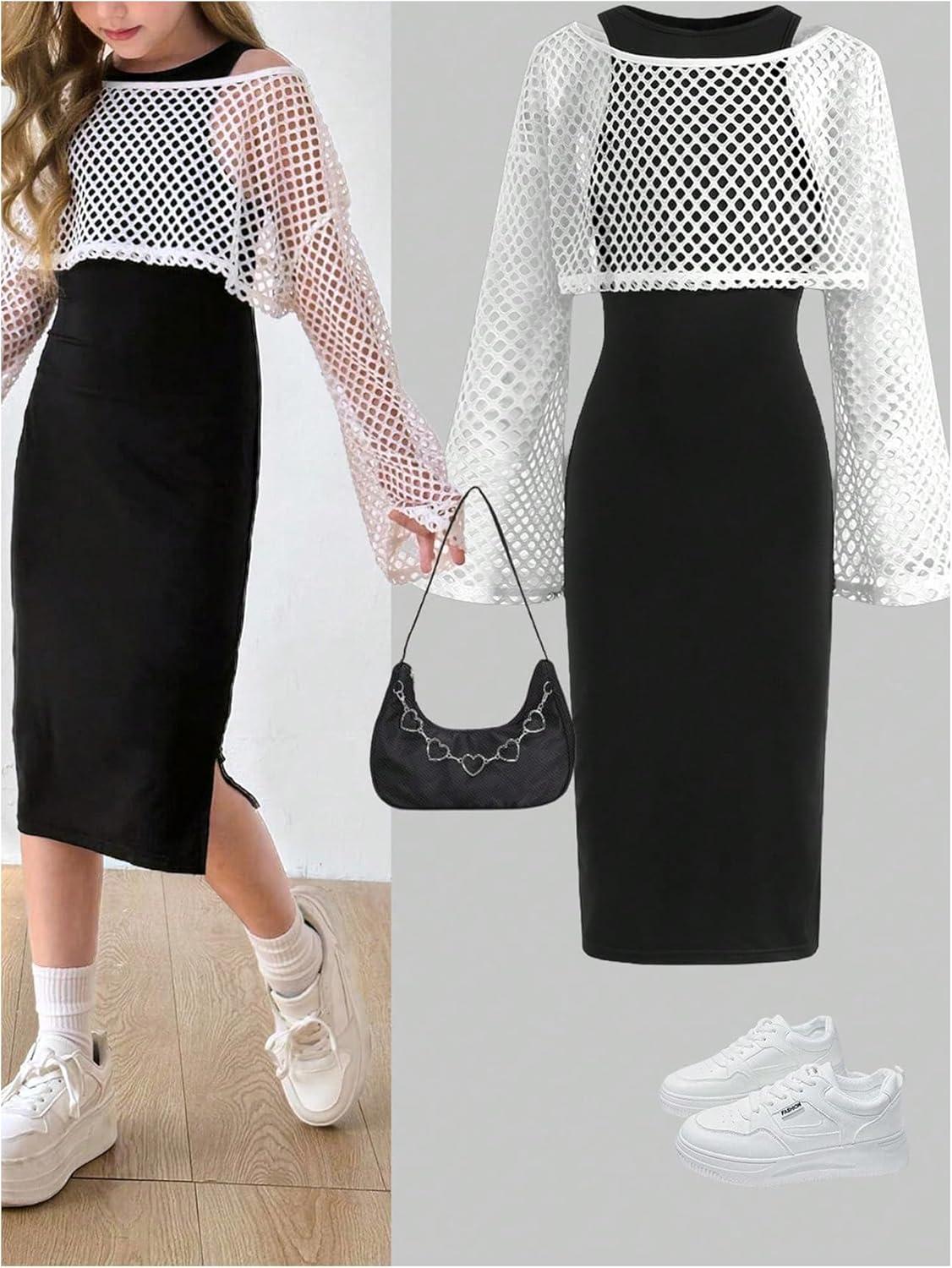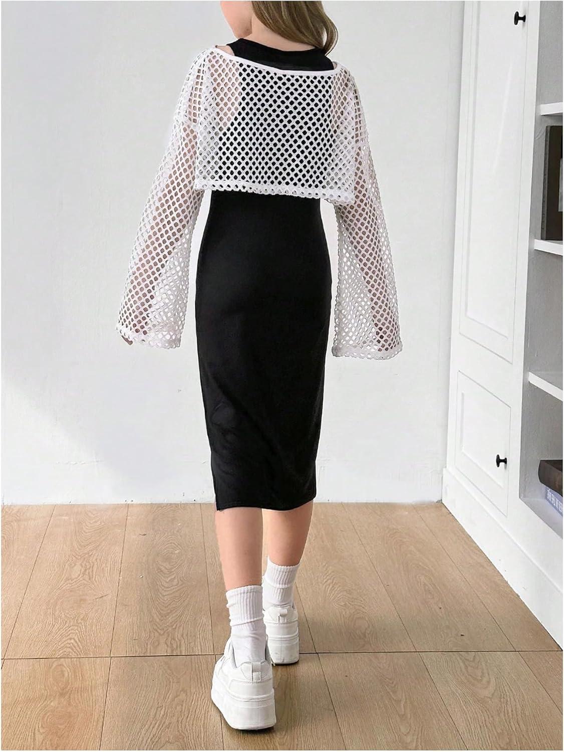 OYOANGLE Cute Girl’s 2 Piece Outfits Midi Tank Dress Side Split and Hollow Out Long Sleeve Crop Tops Sets(Black)