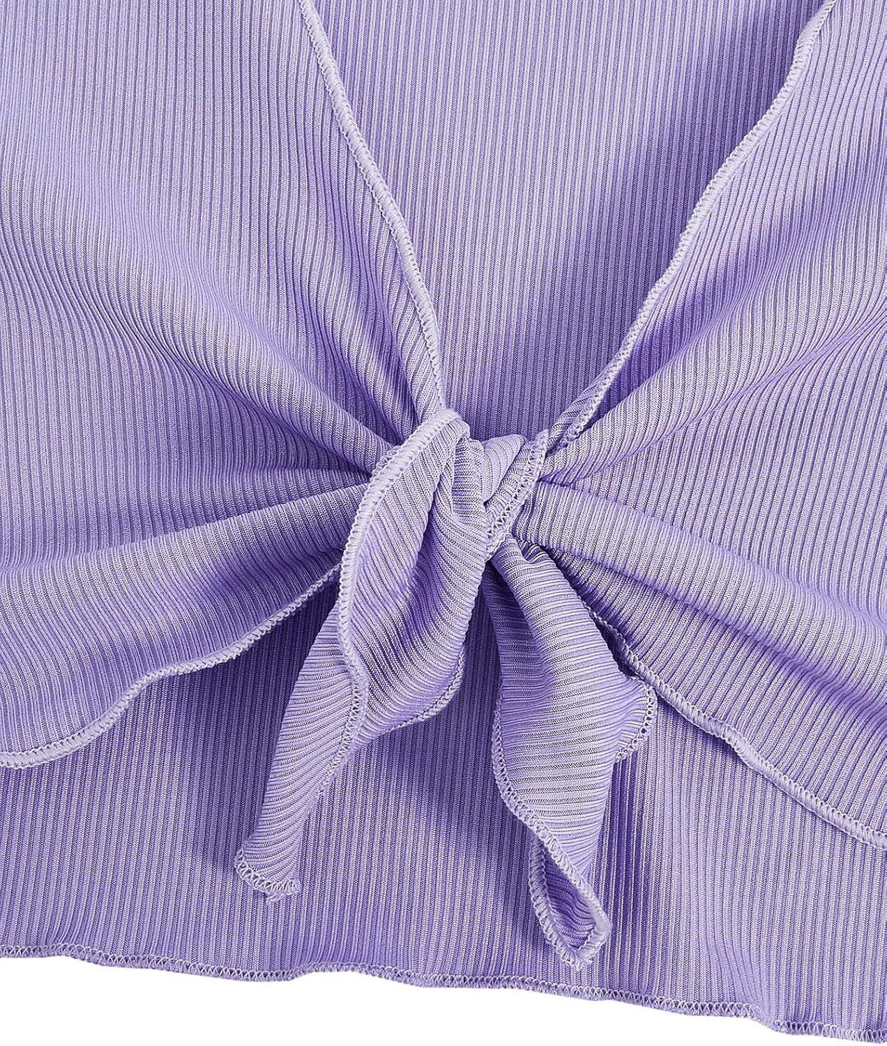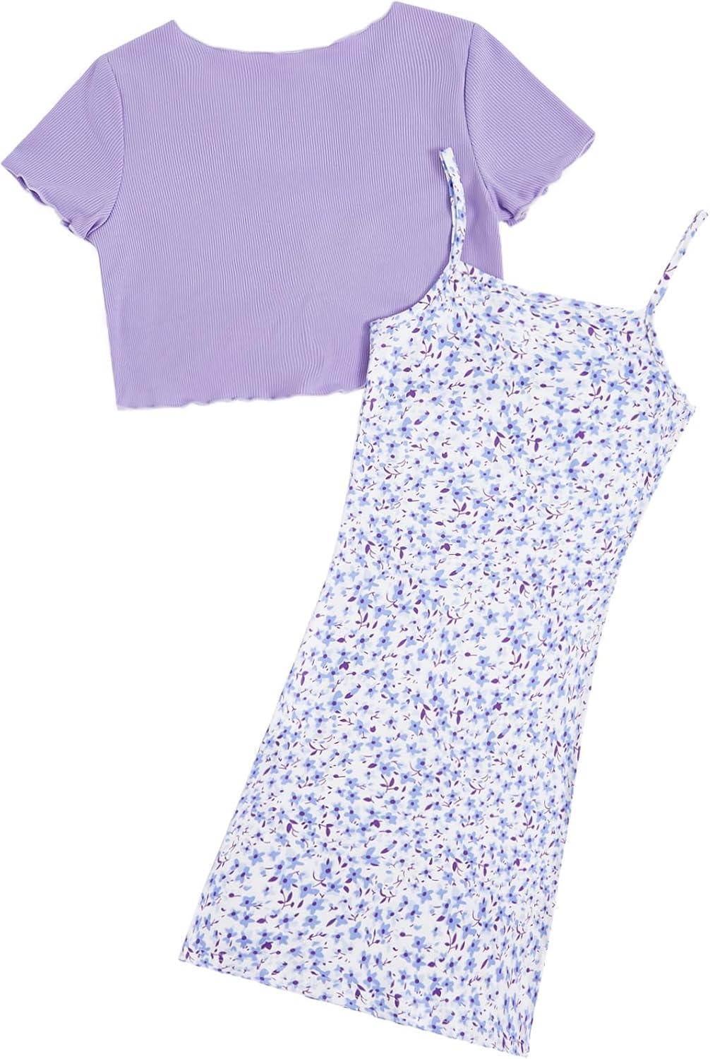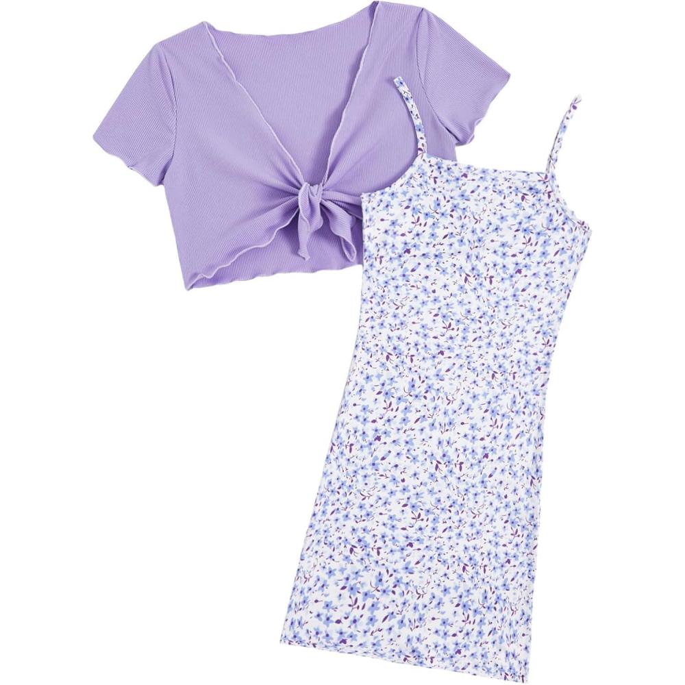 OYOANGLE Girl's 2 Piece Outfits Floral Print Sleeveless Cute Cami Dresses and Short Sleeve Lettuce Trim Tie Front Top Sets(Purple Solid)