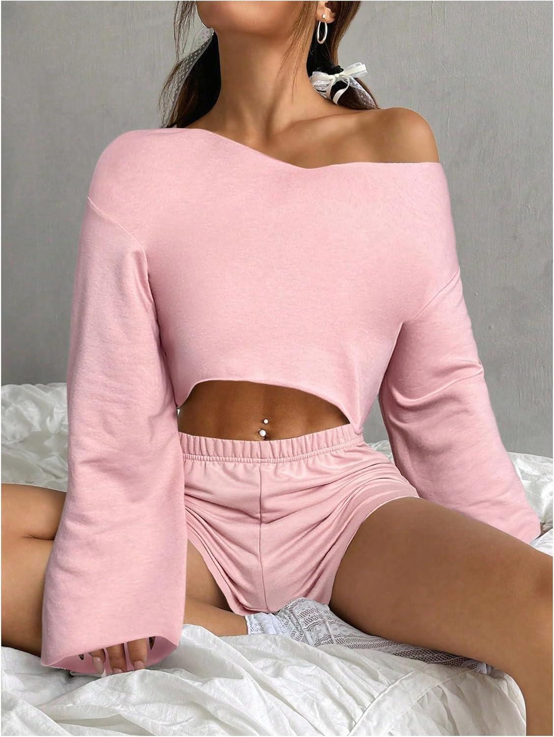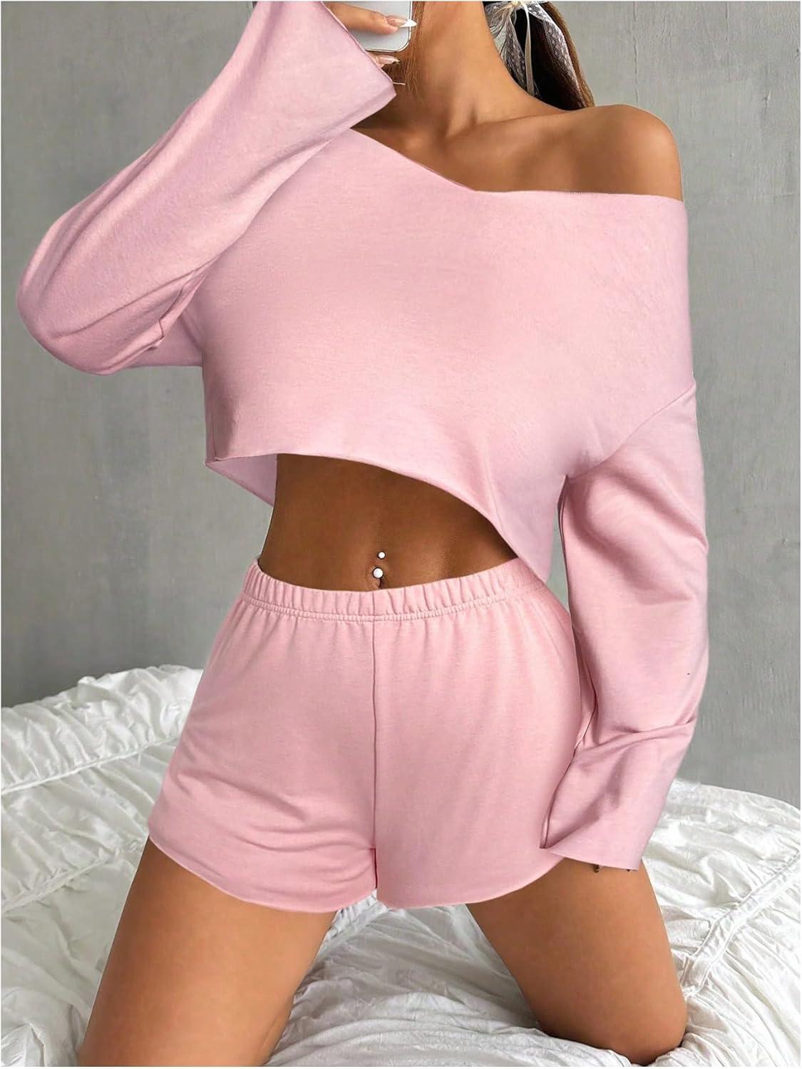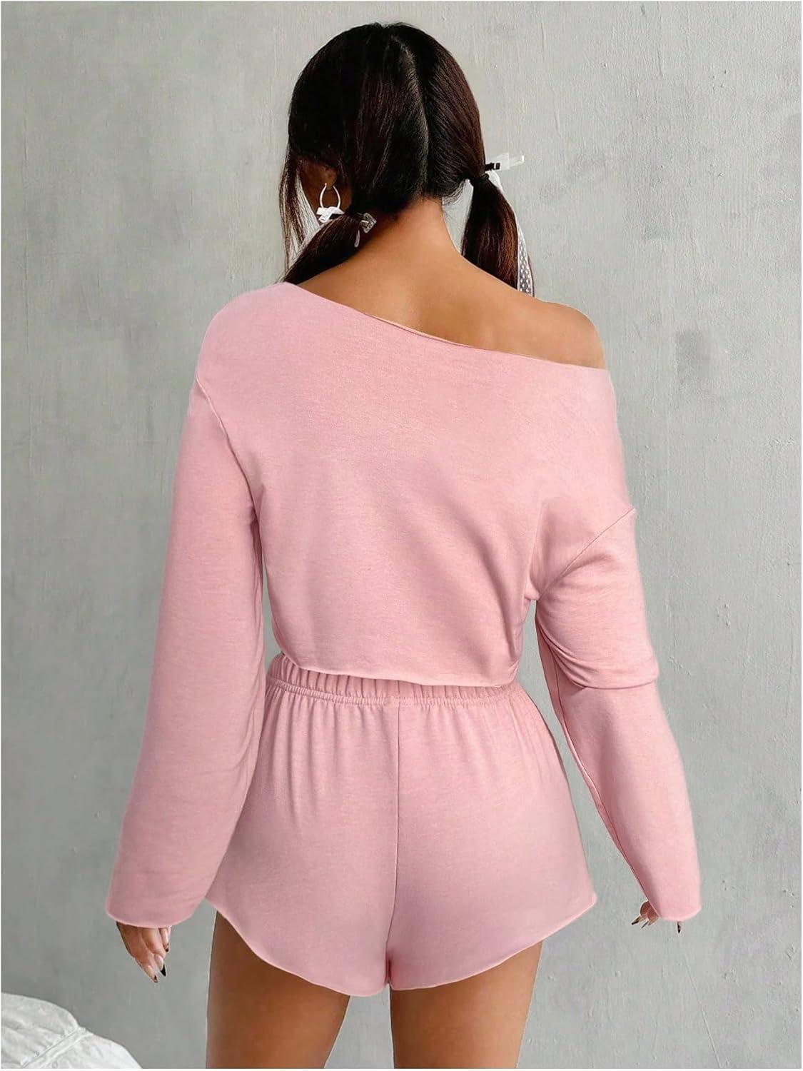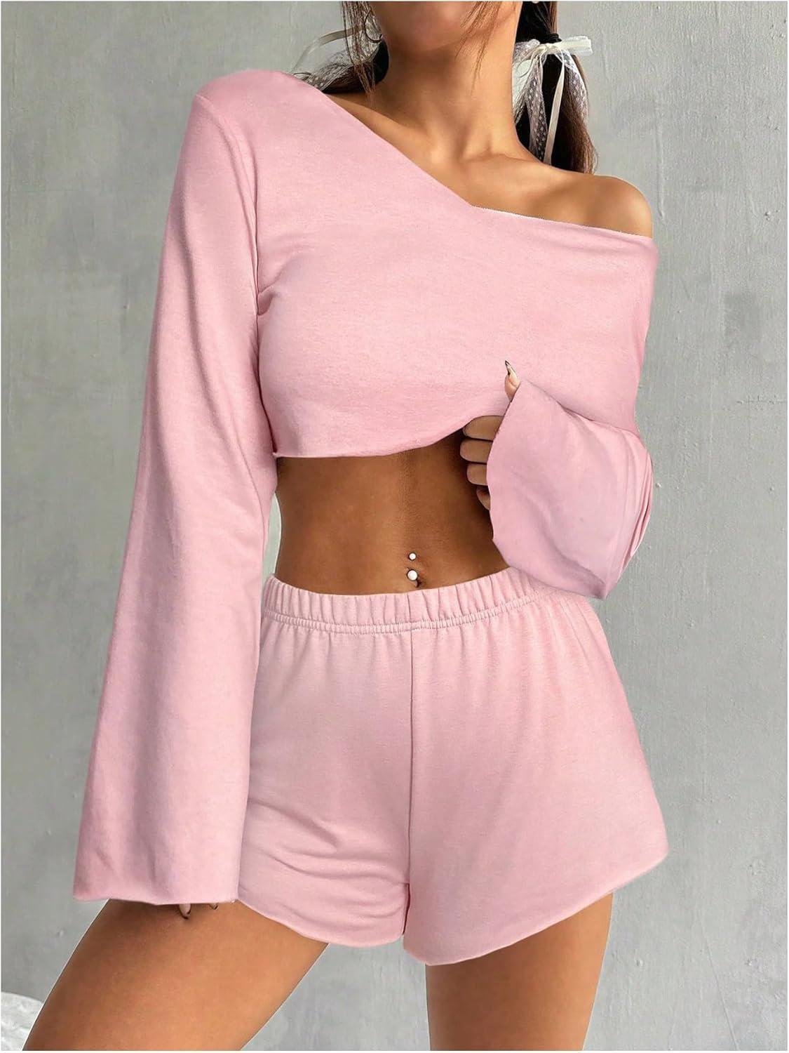 OYOANGLE Girl's 2 Piece Outfits Long Sleeve V Neck Crop Top and Elastic Waist Track Shorts Workout Sets(Pink)
