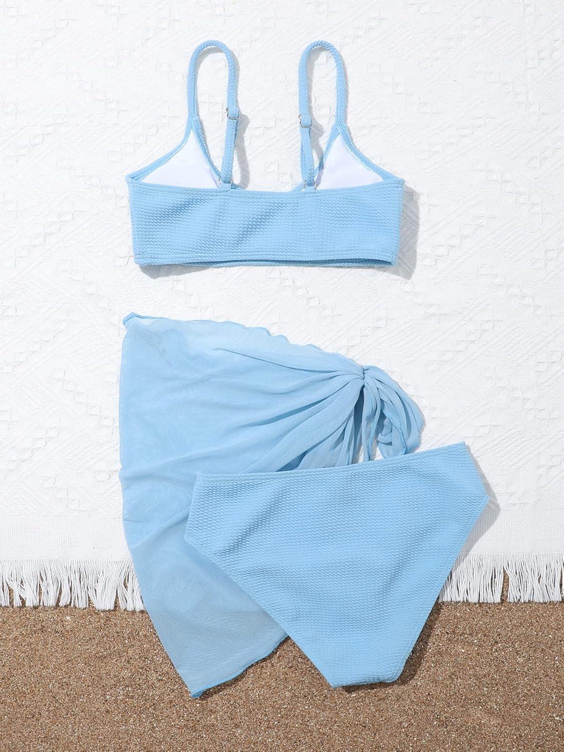 OYOANGLE Girl's 3 Piece Swimsuit Sets Solid Spaghetti Strap Bikini Swimsuit with Beach Skirt(Blue)