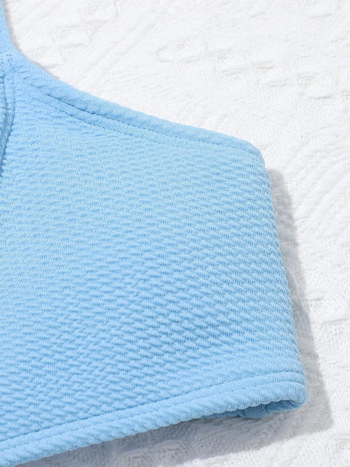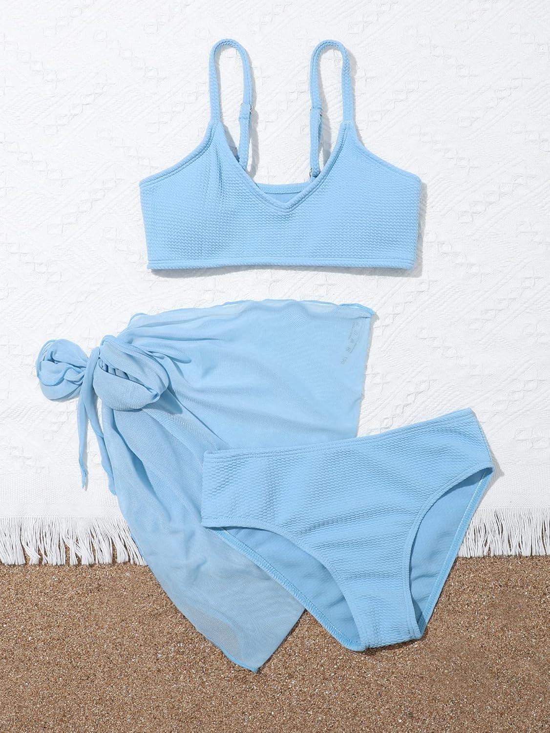 imageOYOANGLE Girls 3 Piece Swimsuit Sets Solid Spaghetti Strap Bikini Swimsuit with Beach SkirtBlue