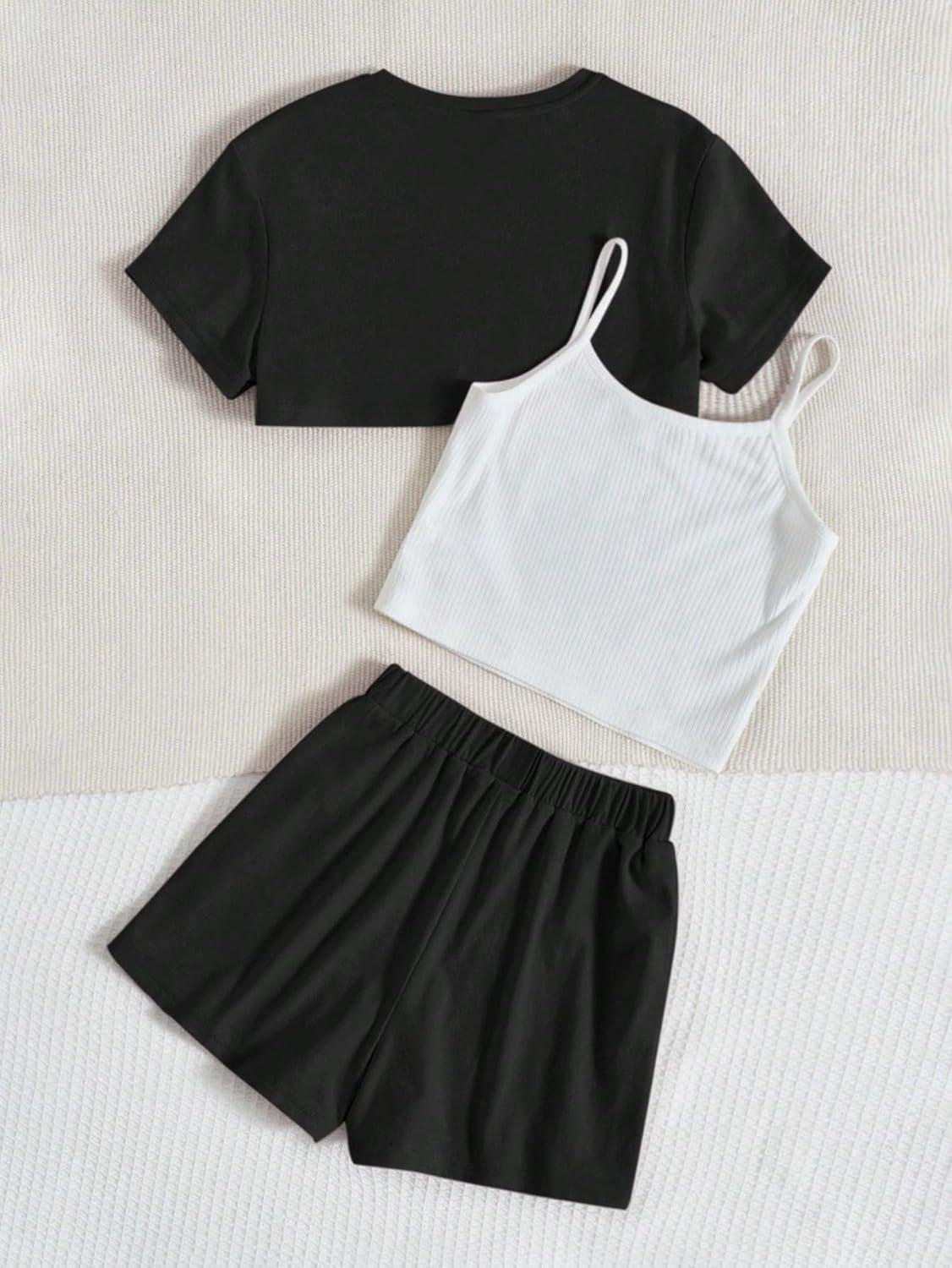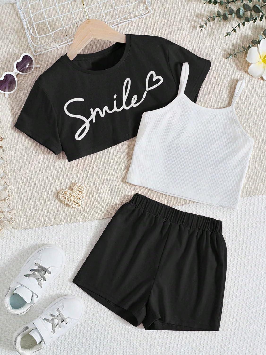 OYOANGLE Girl’s 3 Pieces Summer Outfits Graphic Print Crop Tee Top and Cami Top with Shorts Set(White and Black)