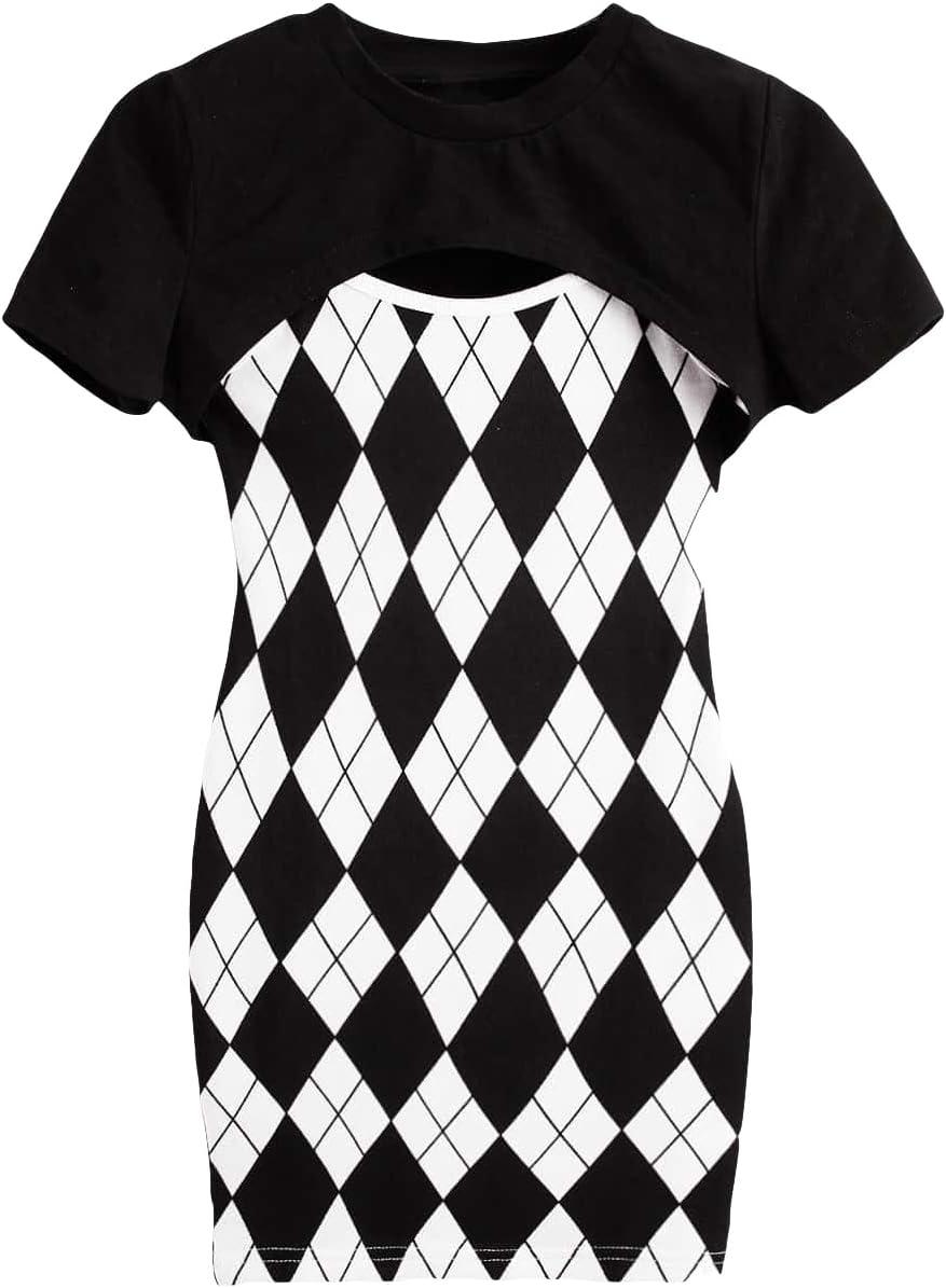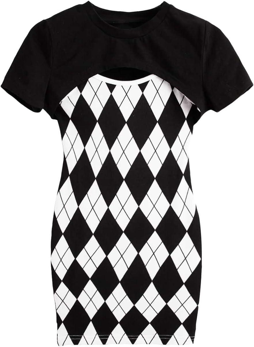 OYOANGLE Girl’s Cute 2 Piece Outfits Print Cami Short Dress with Crop Top Tee Set(Black and White)