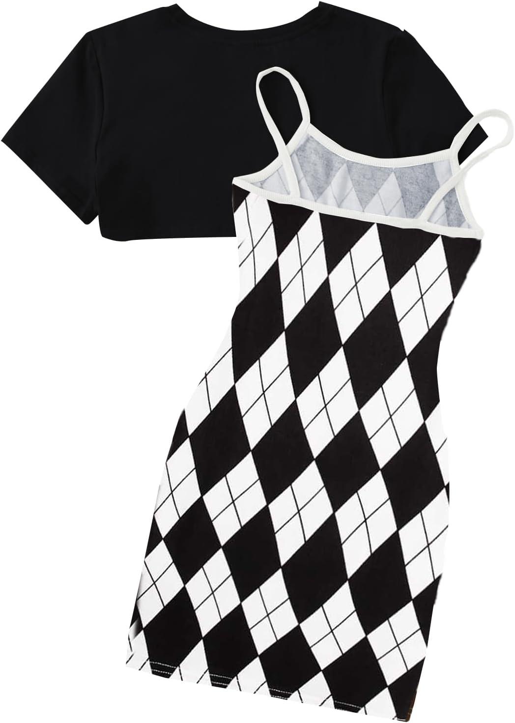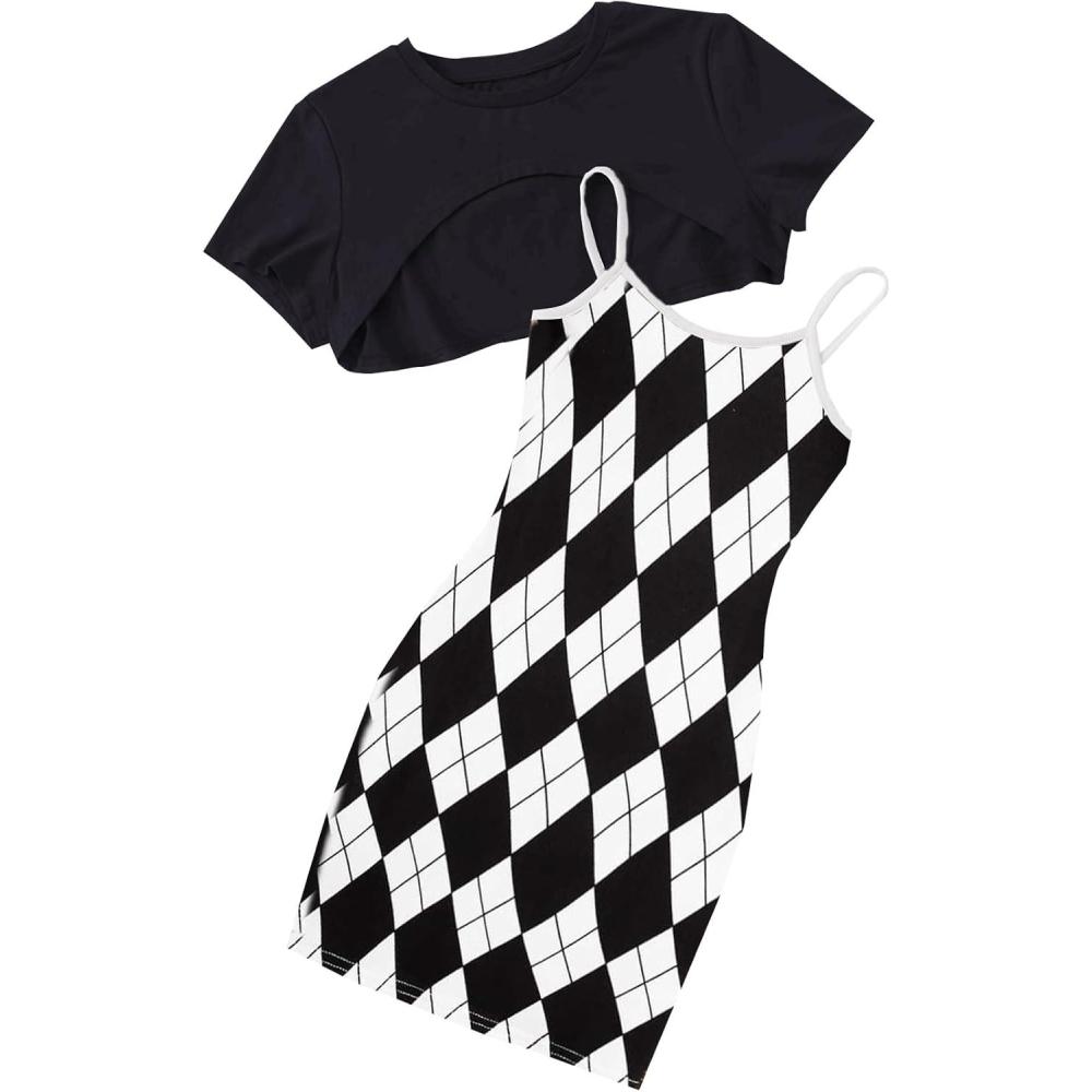 imageOYOANGLE Girls Cute 2 Piece Outfits Print Cami Short Dress with Crop Top Tee SetBlack and White