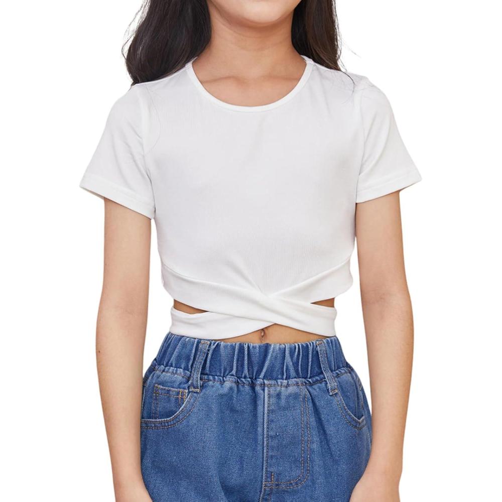 OYOANGLE Girl's Cute Crisscross Short Sleeve Cutout Solid Crop Top Tee T-Shirts(White)