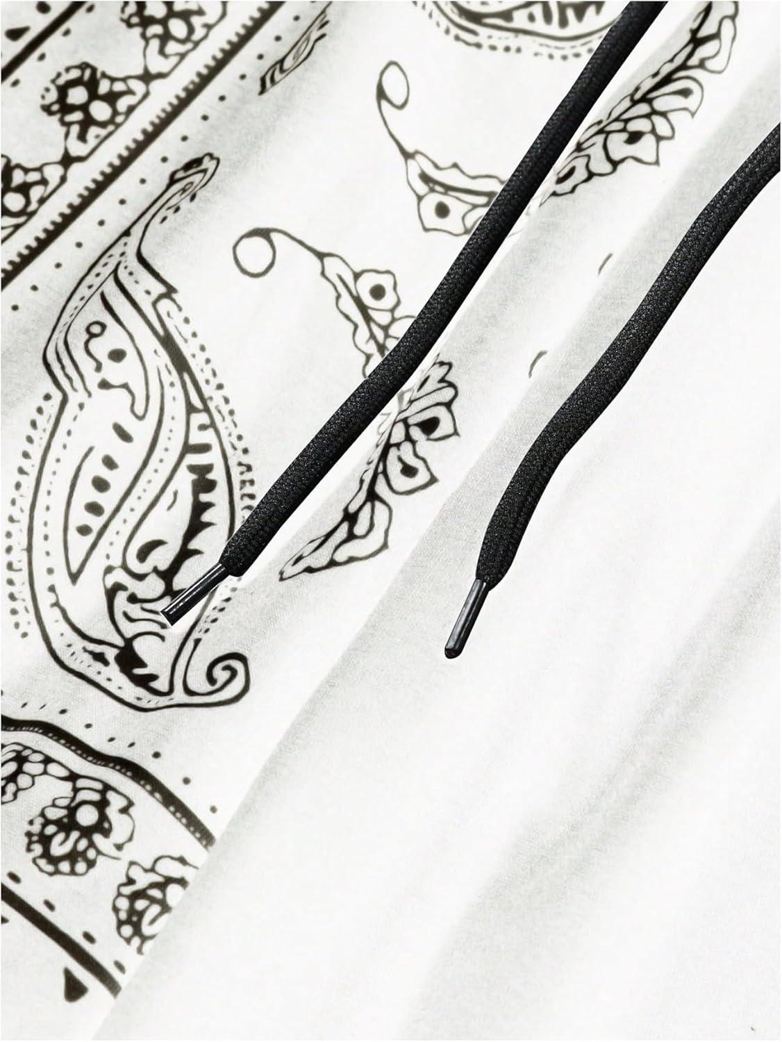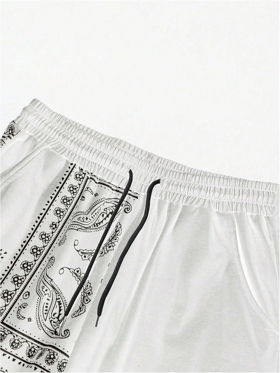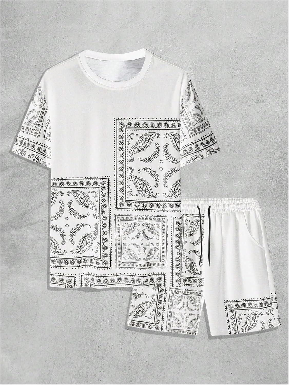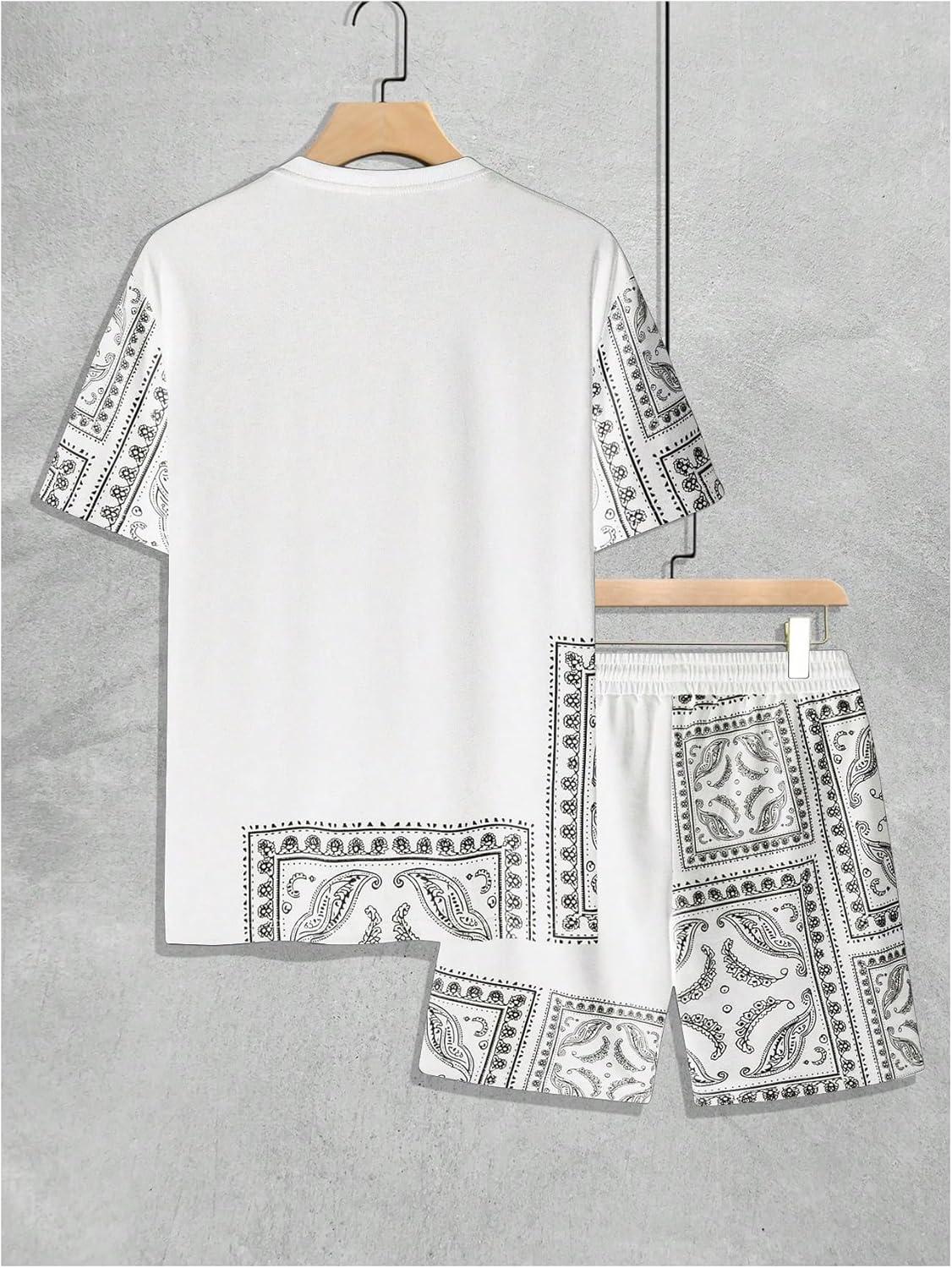 OYOANGLE Men’s 2 Piece Outfits Boho Paisley Print Short Sleeve Top and Drawstring Shorts Set Tracksuits(White)