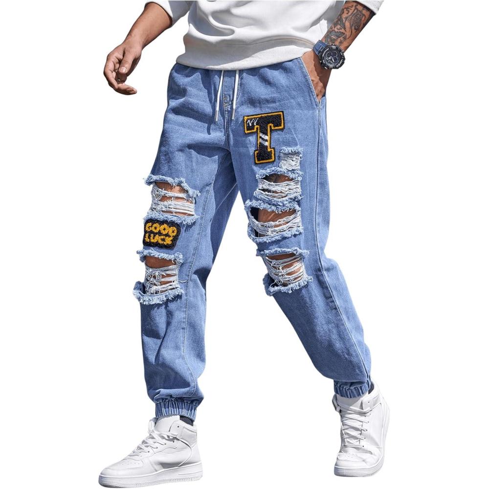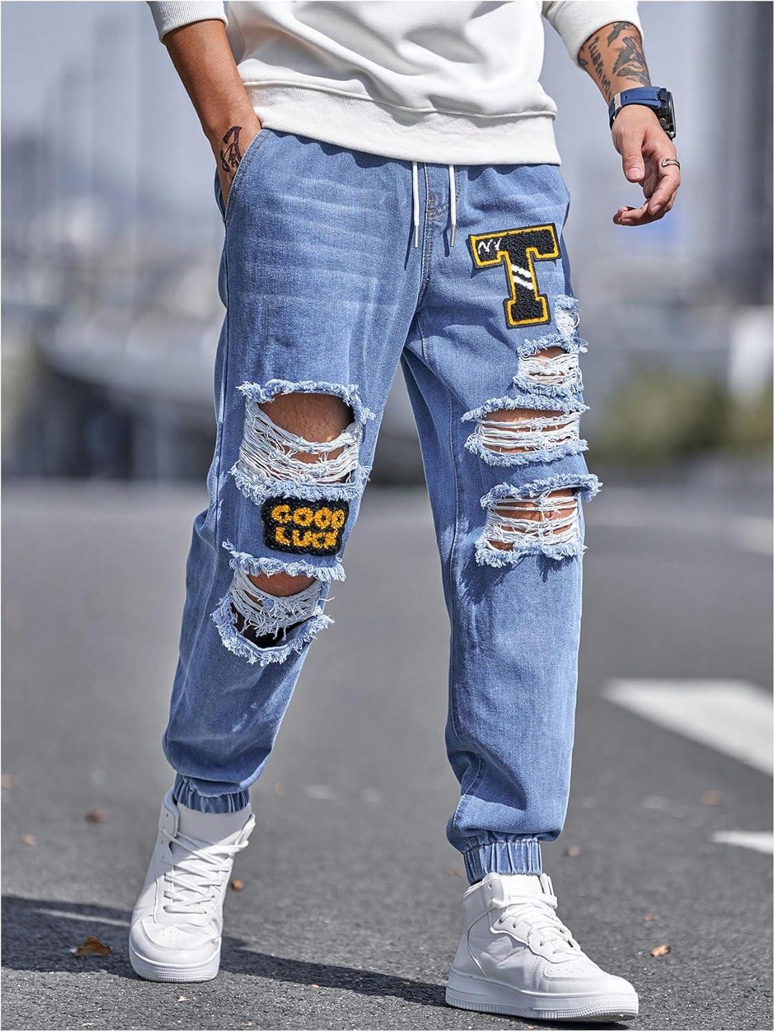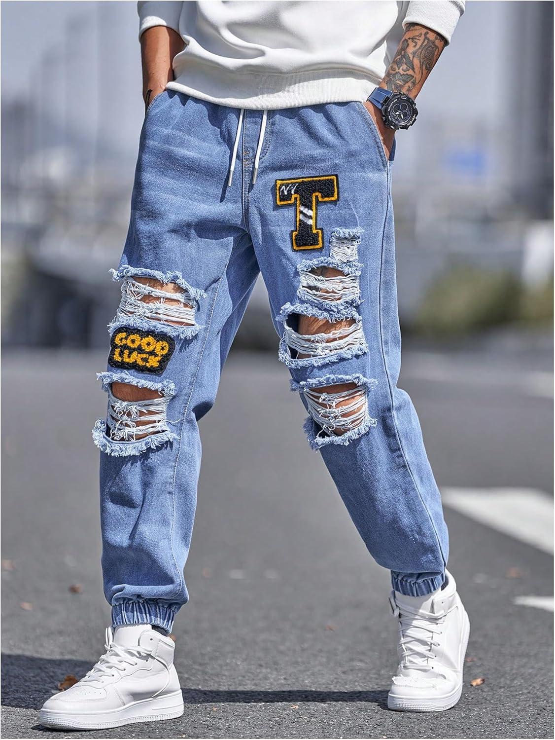 OYOANGLE Men's Cargo Joggers Pants Letter Patched Ripped Jeans Elastic Drawstring Waist Distressed Denim Pants(Medium Wash)