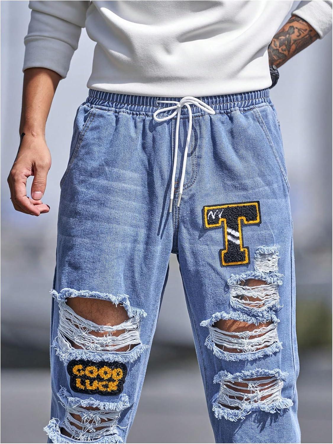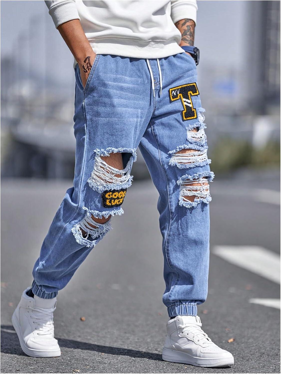 OYOANGLE Men’s Cargo Joggers Pants Letter Patched Ripped Jeans Elastic Drawstring Waist Distressed Denim Pants(Light Wash)