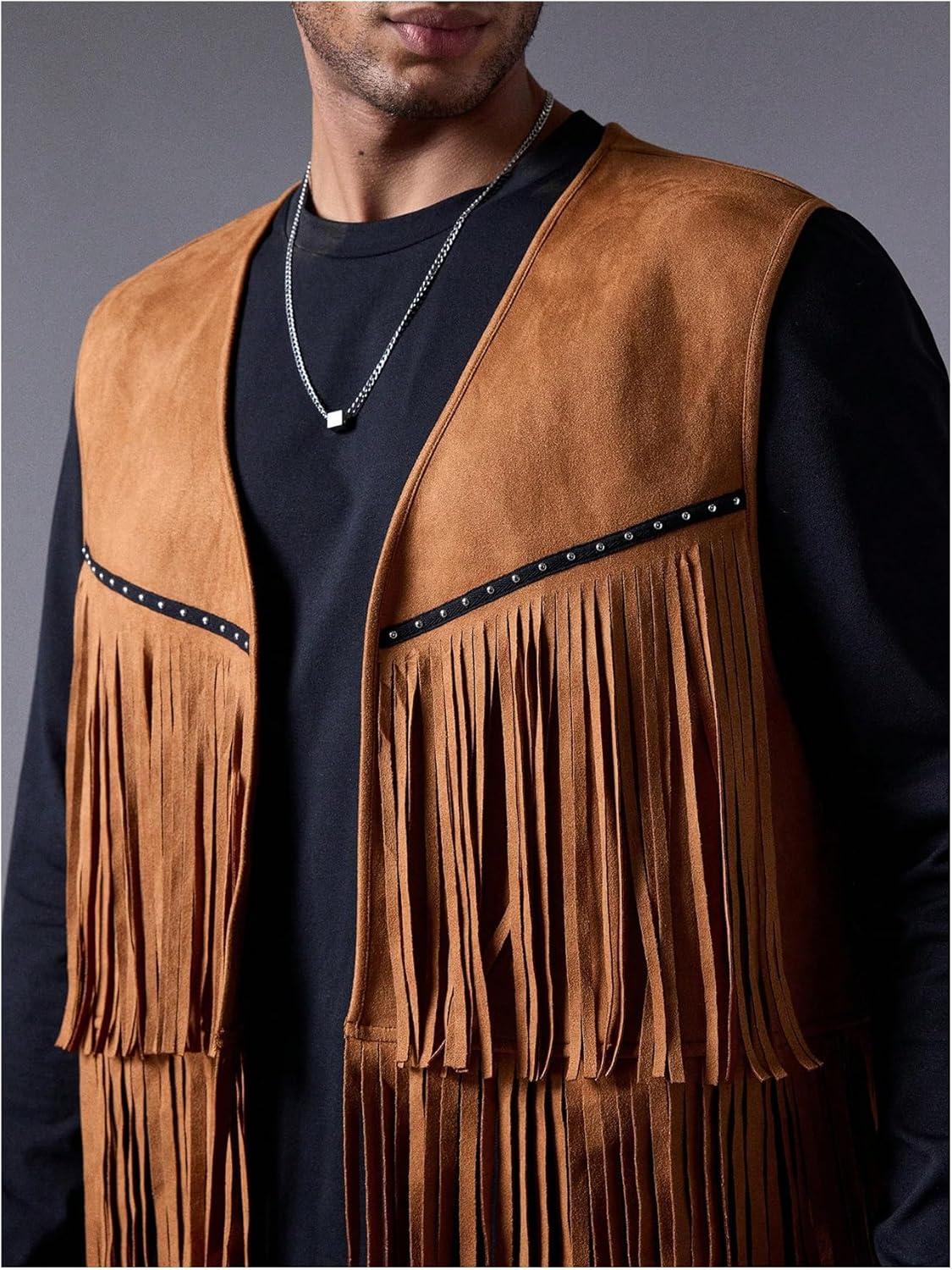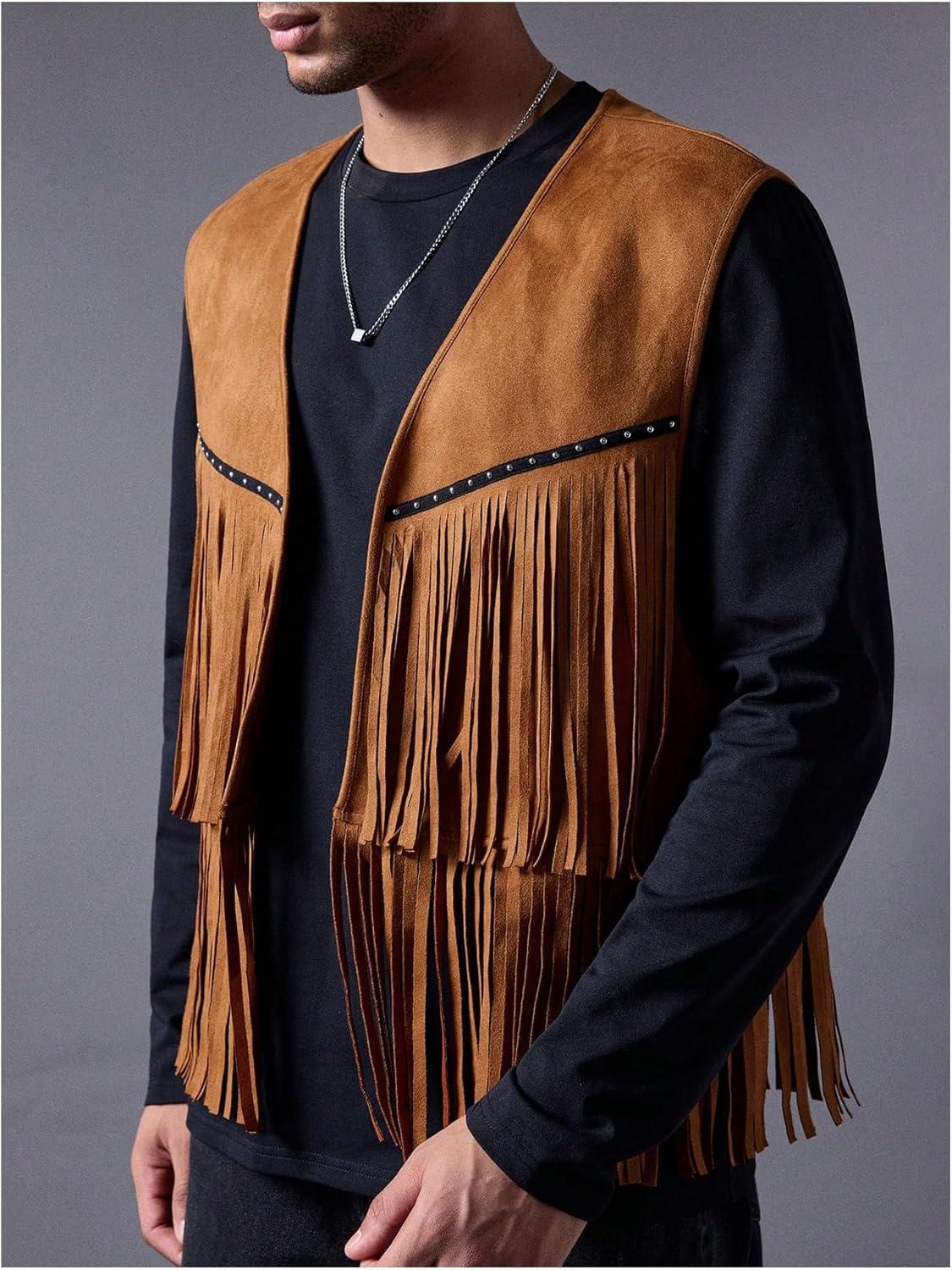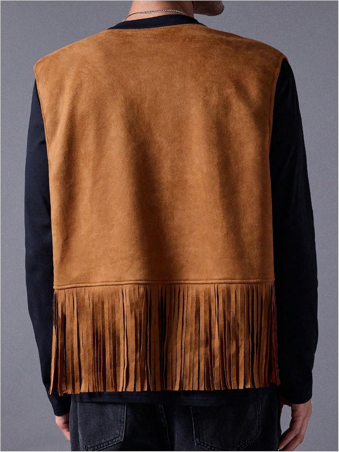 imageOYOANGLE Mens Casual Suede Top Shirt Boho Fringe Trim Open Front Sleeveless Vest Jacket WaistcoatBrown