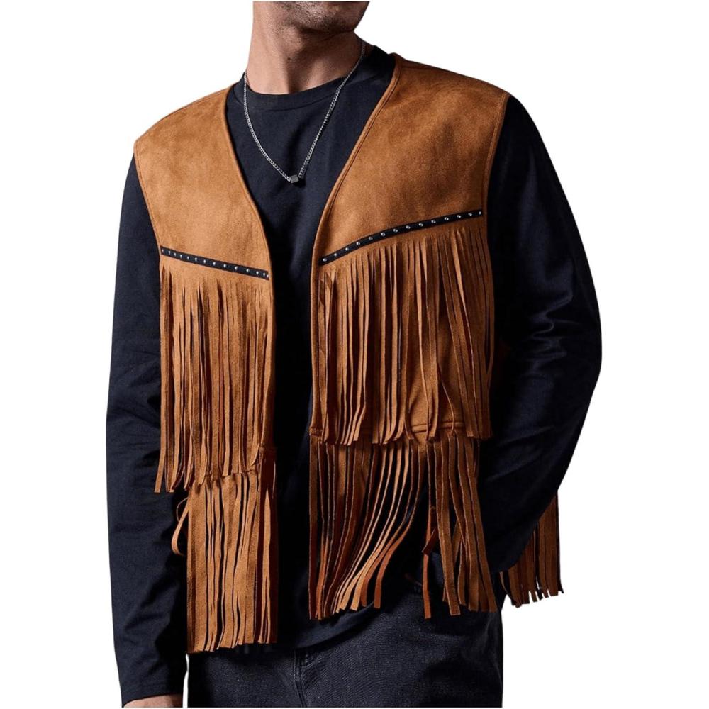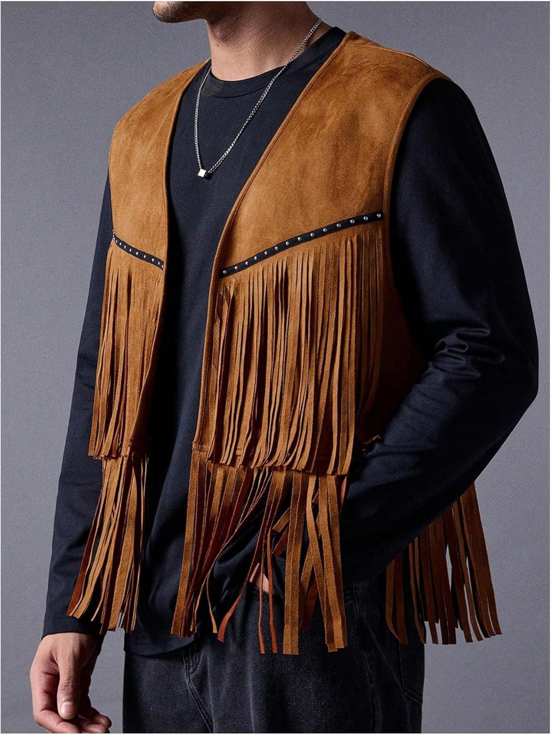 OYOANGLE Men's Casual Suede Top Shirt Boho Fringe Trim Open Front Sleeveless Vest Jacket Waistcoat(Brown)