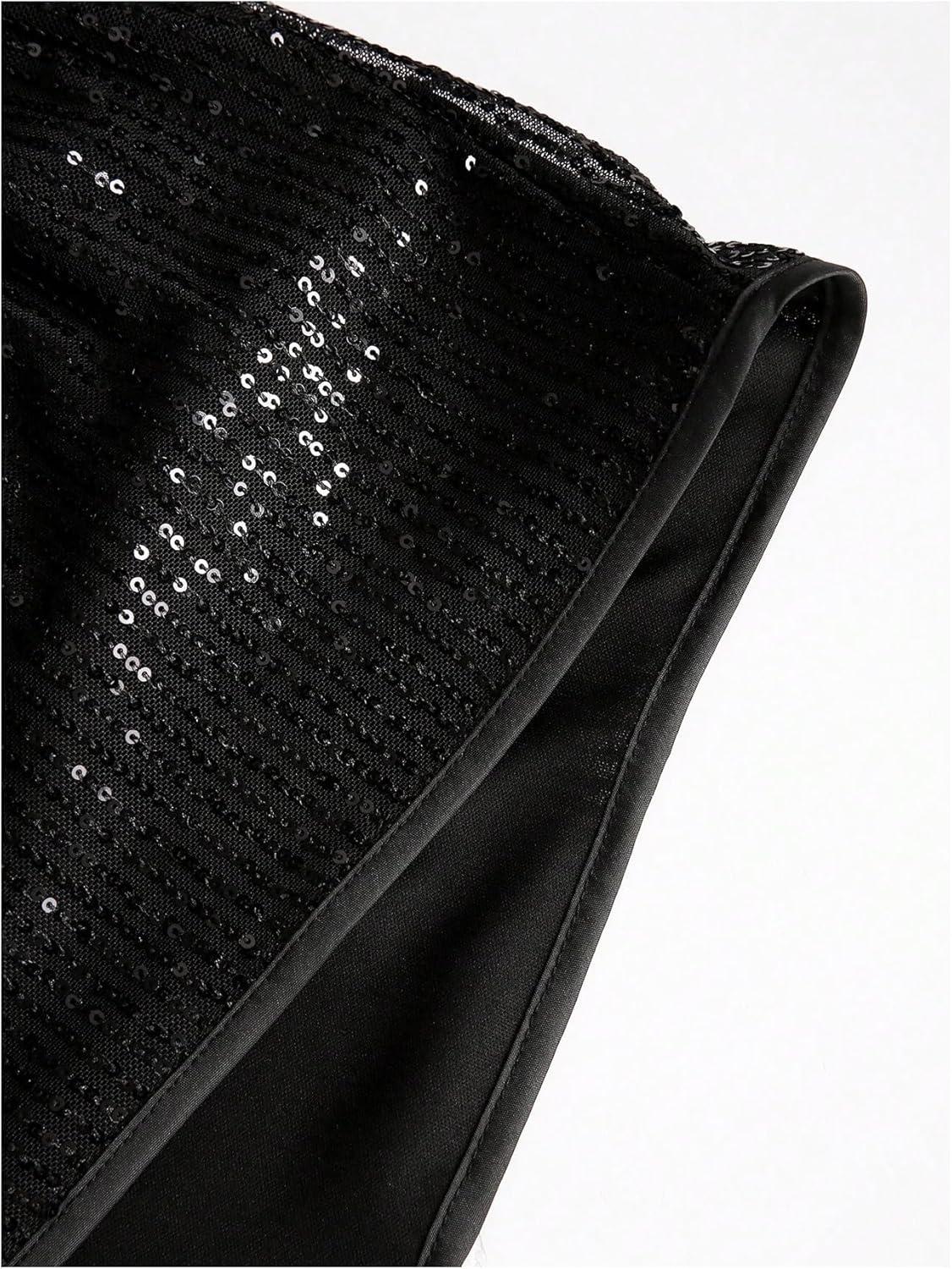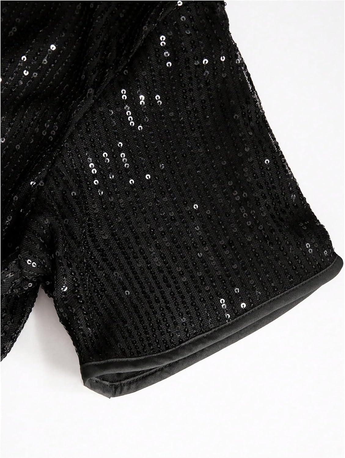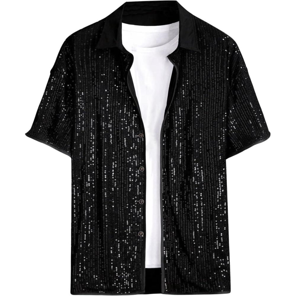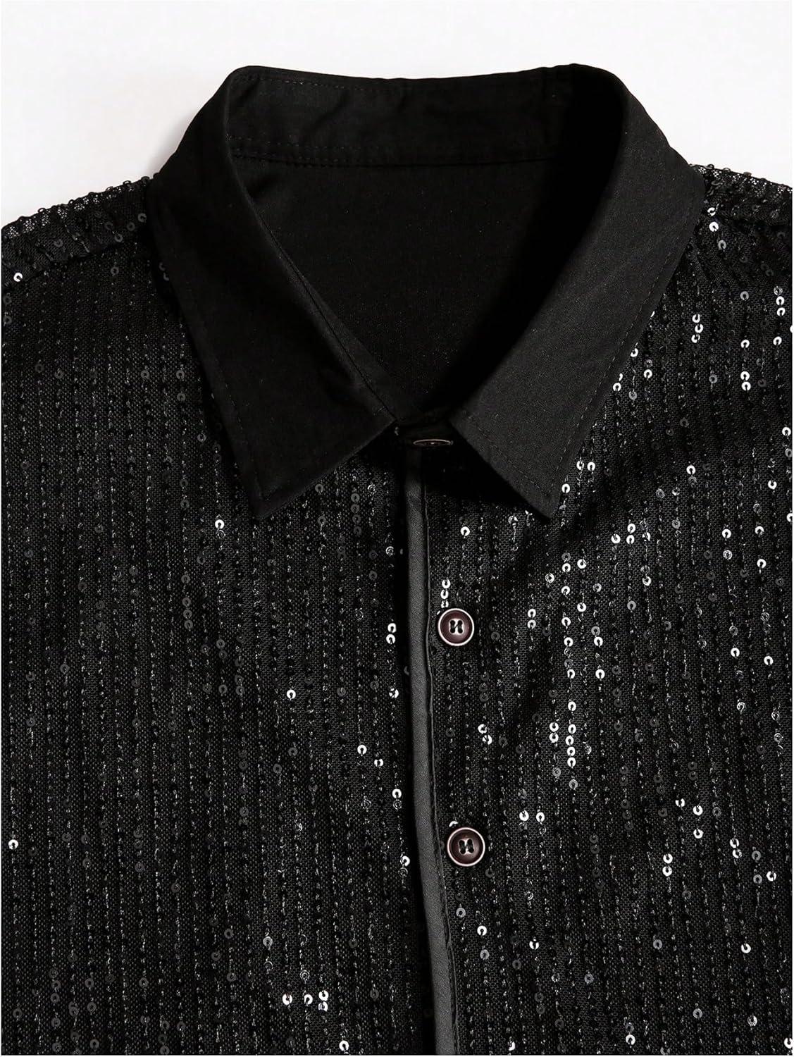 OYOANGLE Men's Sequin Shiny Button Down Shirt Short Sleeve Collared Shirts Party Holiday Tops(Black)
