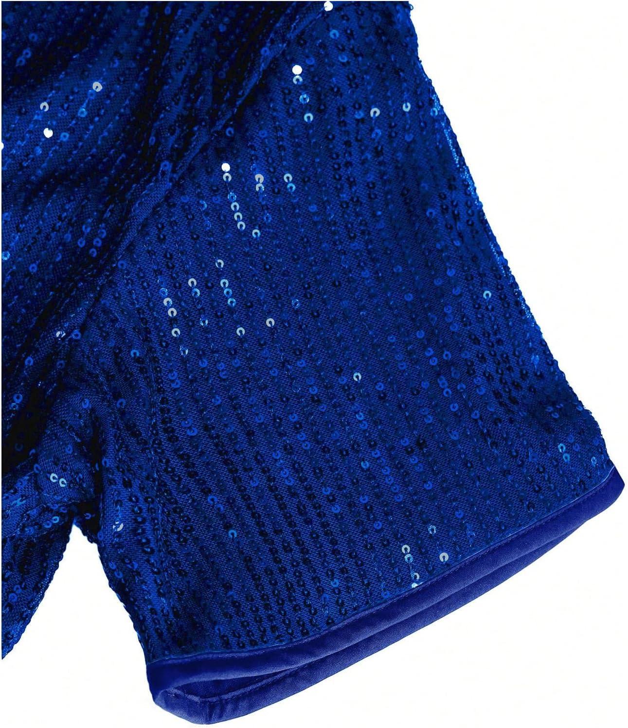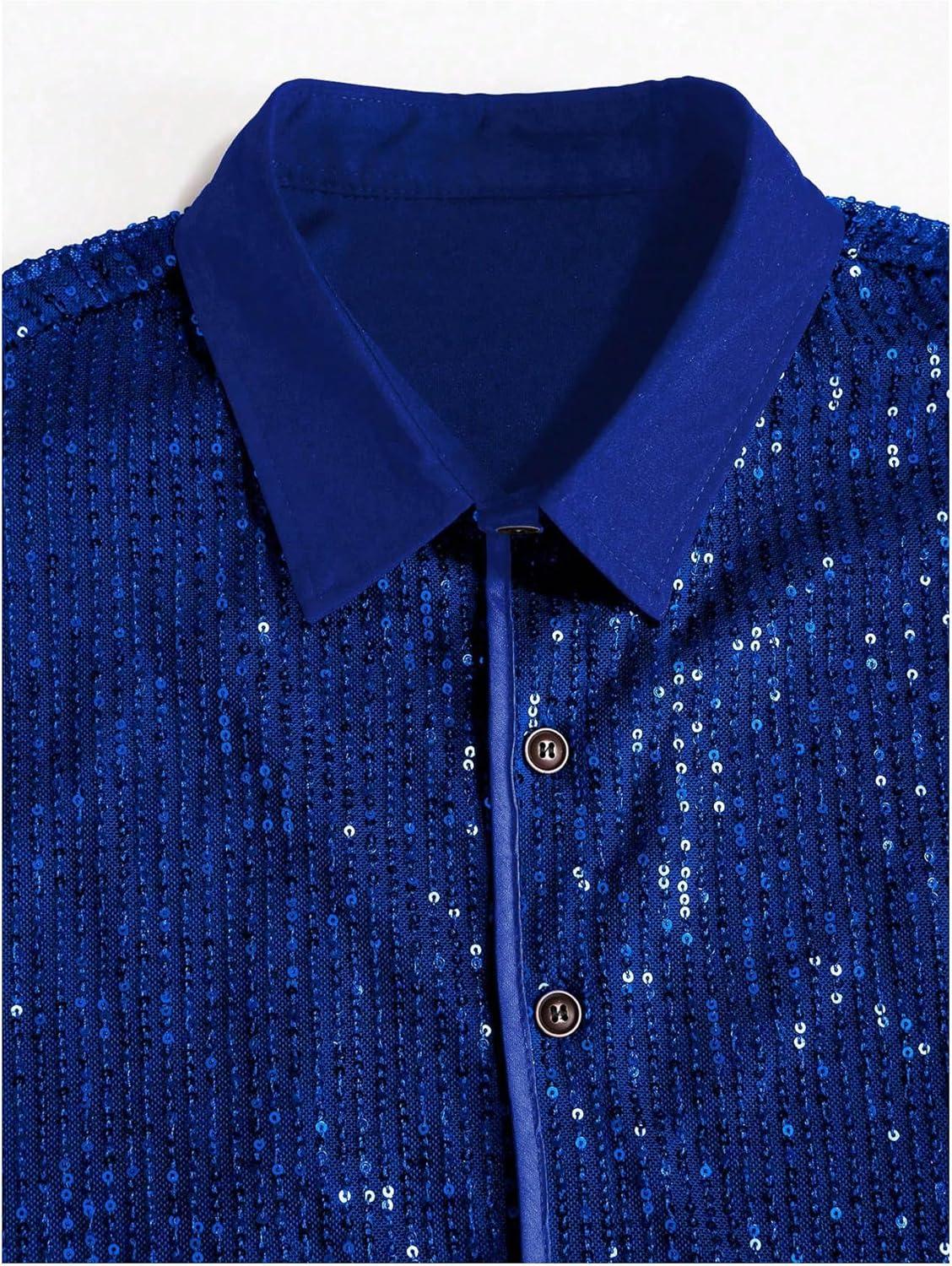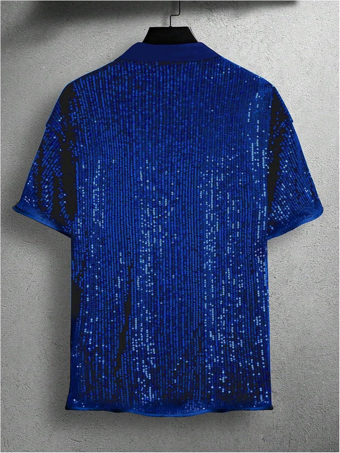 OYOANGLE Men’s Sequin Shiny Button Down Shirt Short Sleeve Collared Shirts Party Holiday Tops(Blue)