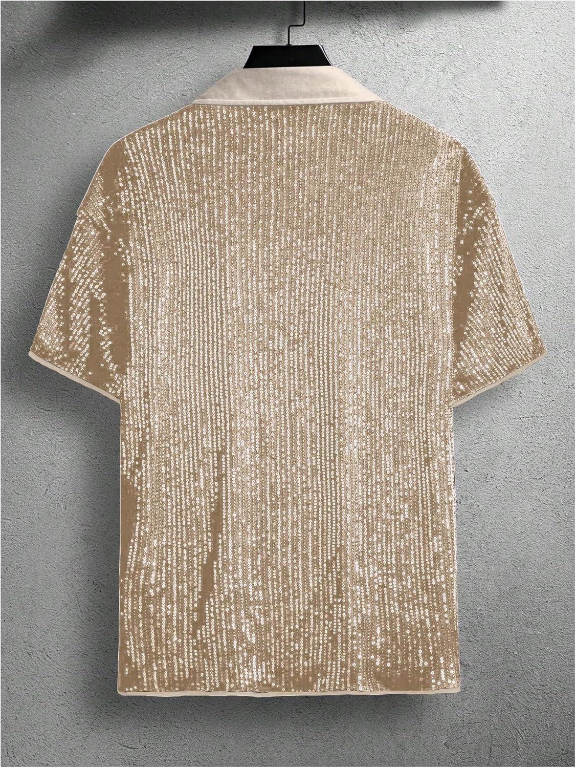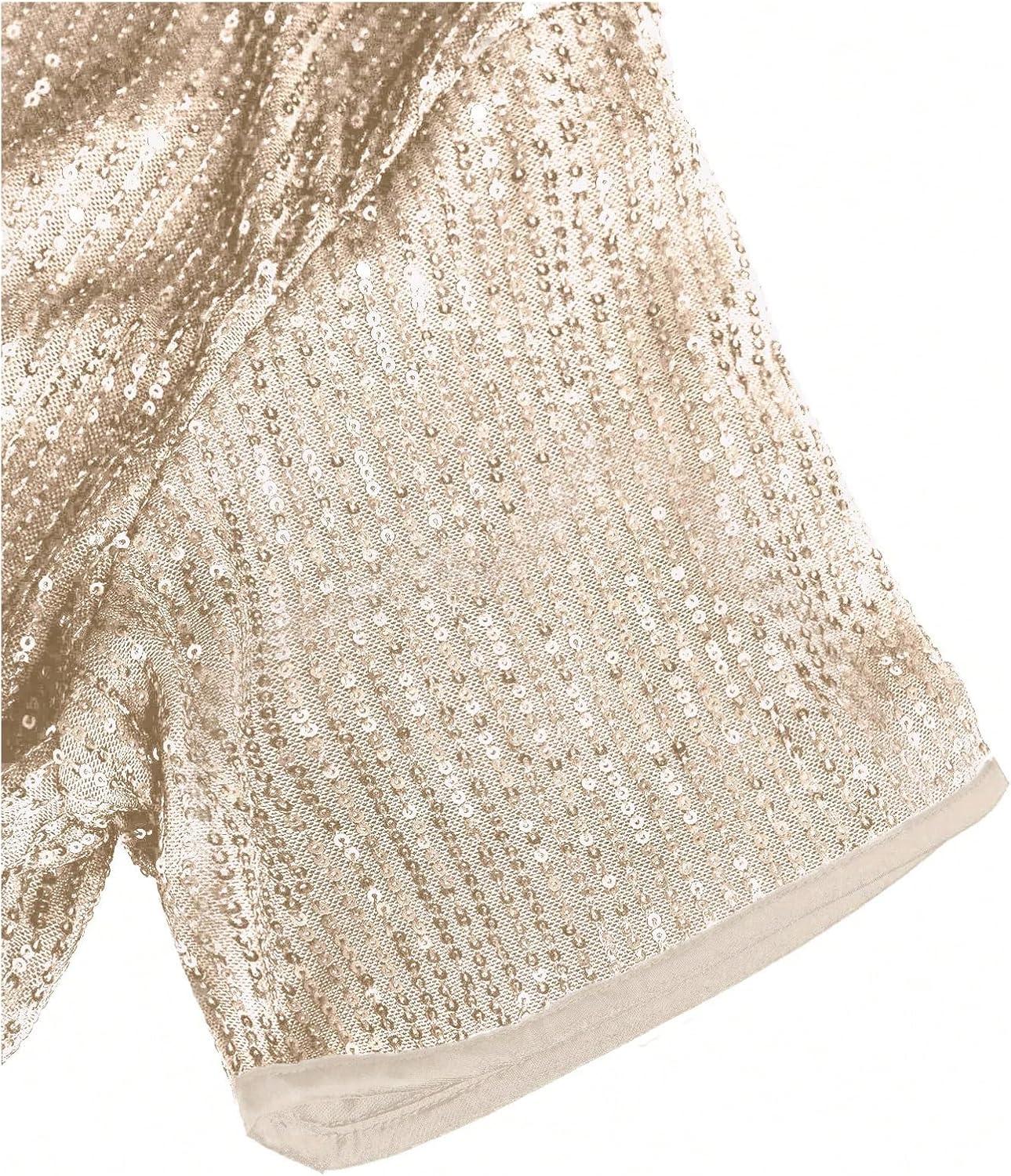 OYOANGLE Men's Sequin Shiny Button Down Shirt Short Sleeve Collared Shirts Party Holiday Tops(Champagne)