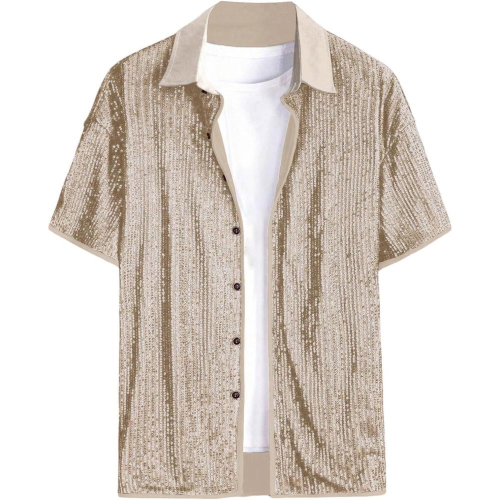OYOANGLE Men’s Sequin Shiny Button Down Shirt Short Sleeve Collared Shirts Party Holiday Tops(Champagne)