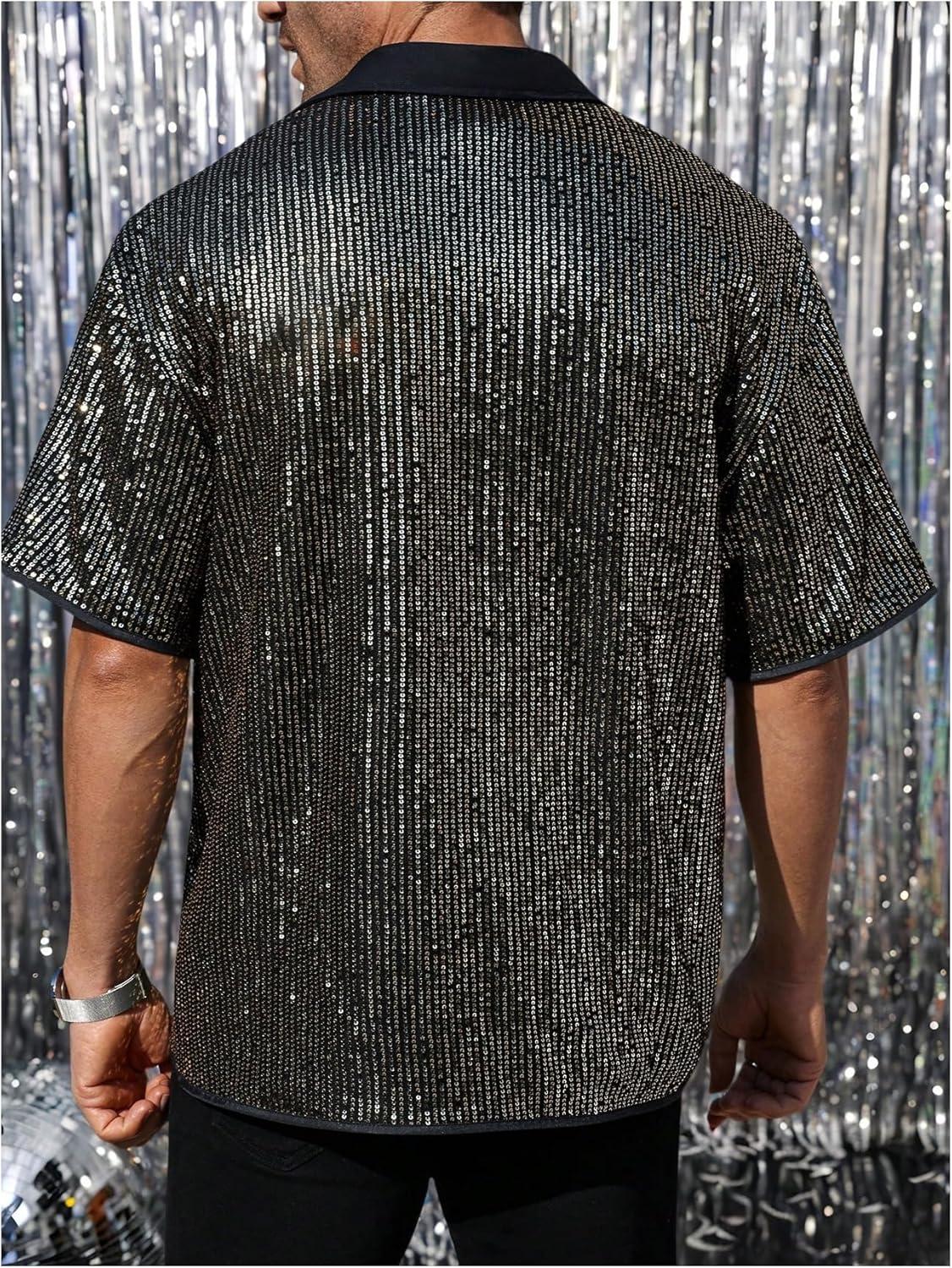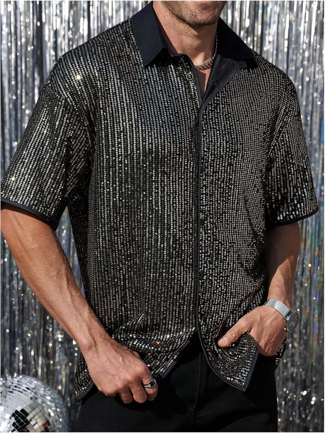 OYOANGLE Men’s Sequin Shiny Button Down Shirt Short Sleeve Collared Shirts Party Holiday Tops(Dark Black)