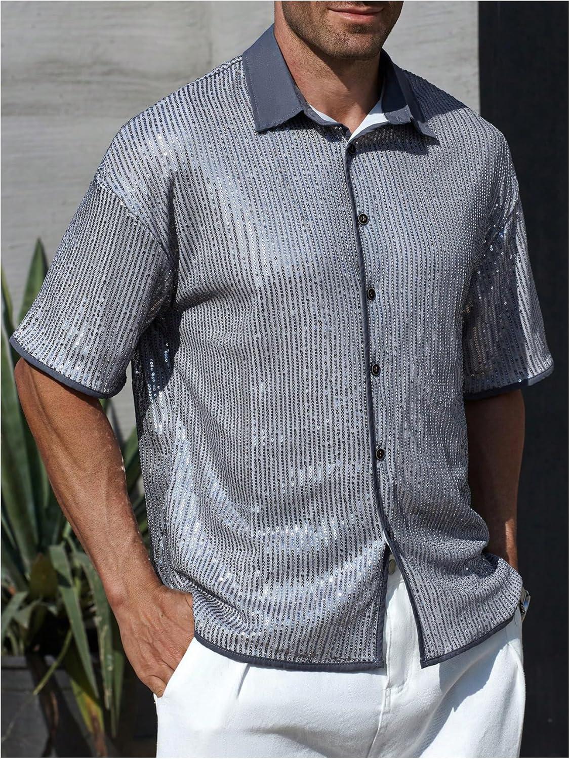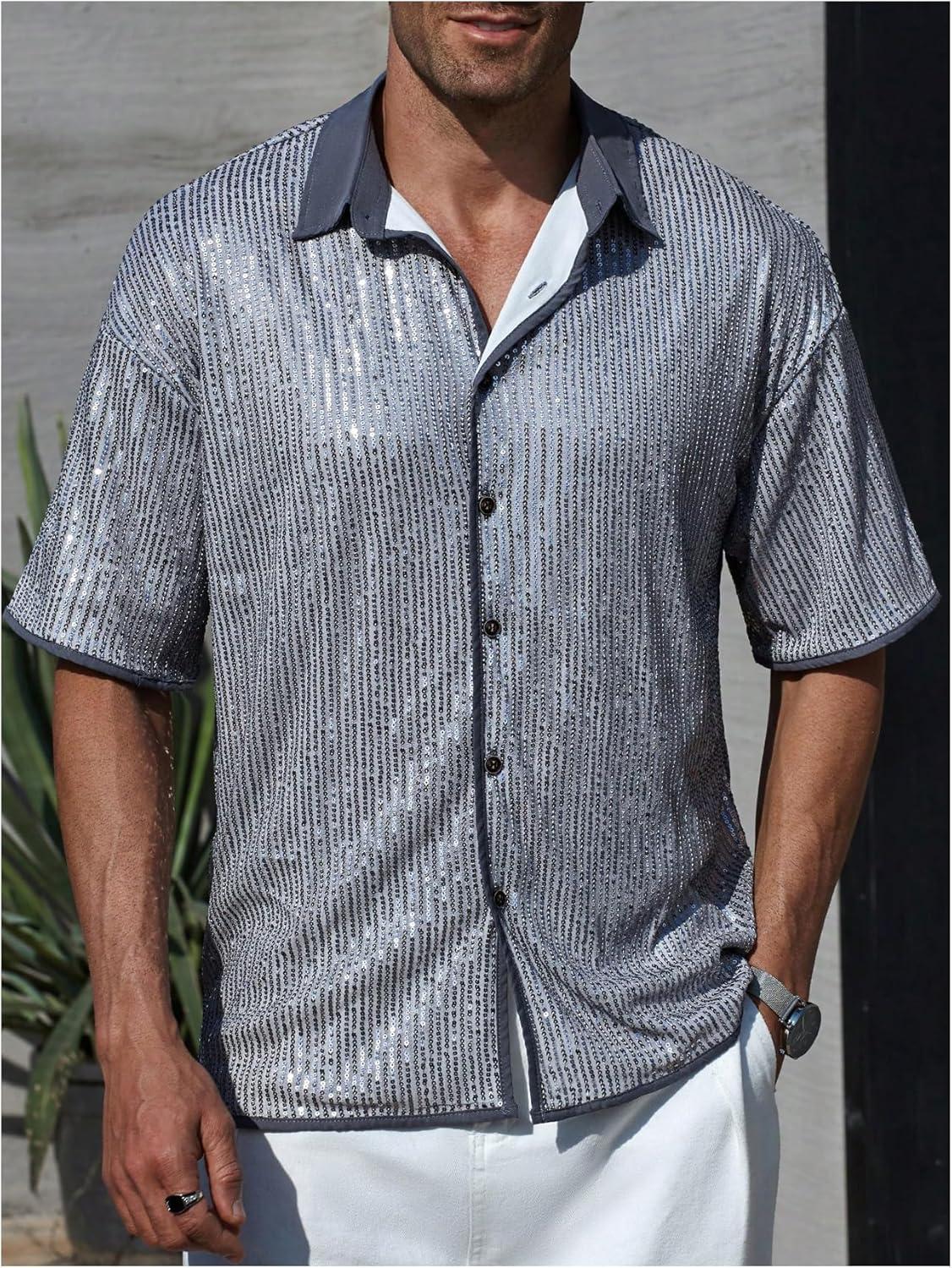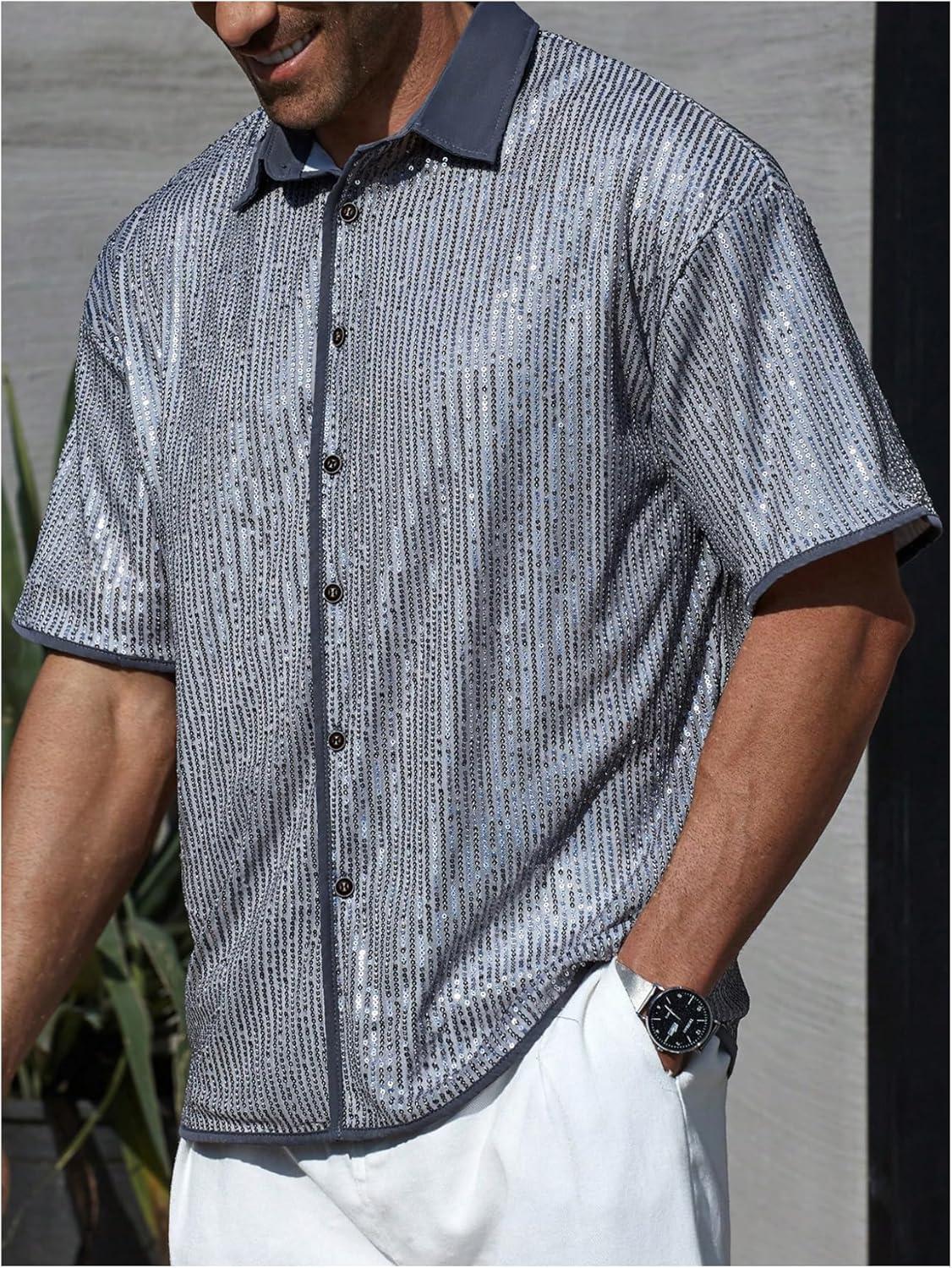 OYOANGLE Men’s Sequin Shiny Button Down Shirt Short Sleeve Collared Shirts Party Holiday Tops(Light Grey)