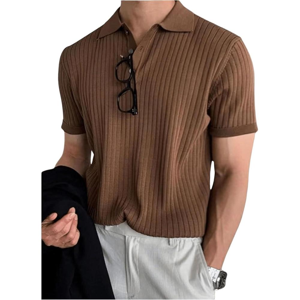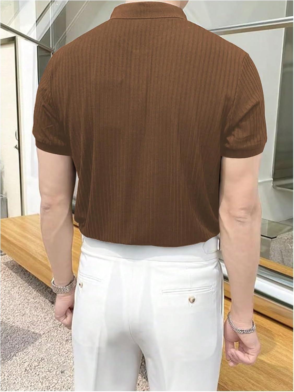 imageOYOANGLE Mens Short Sleeve Collared Shirts Button Front Ribbed Knit Solid Shirt TopBrown