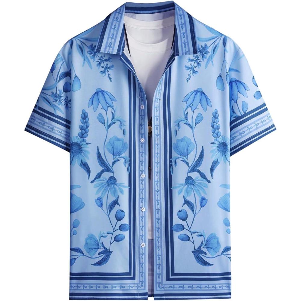 OYOANGLE Men’s Short Sleeve Hawaiian Shirts Floral Button Down Shirt Summer Beach Tops(Blue)