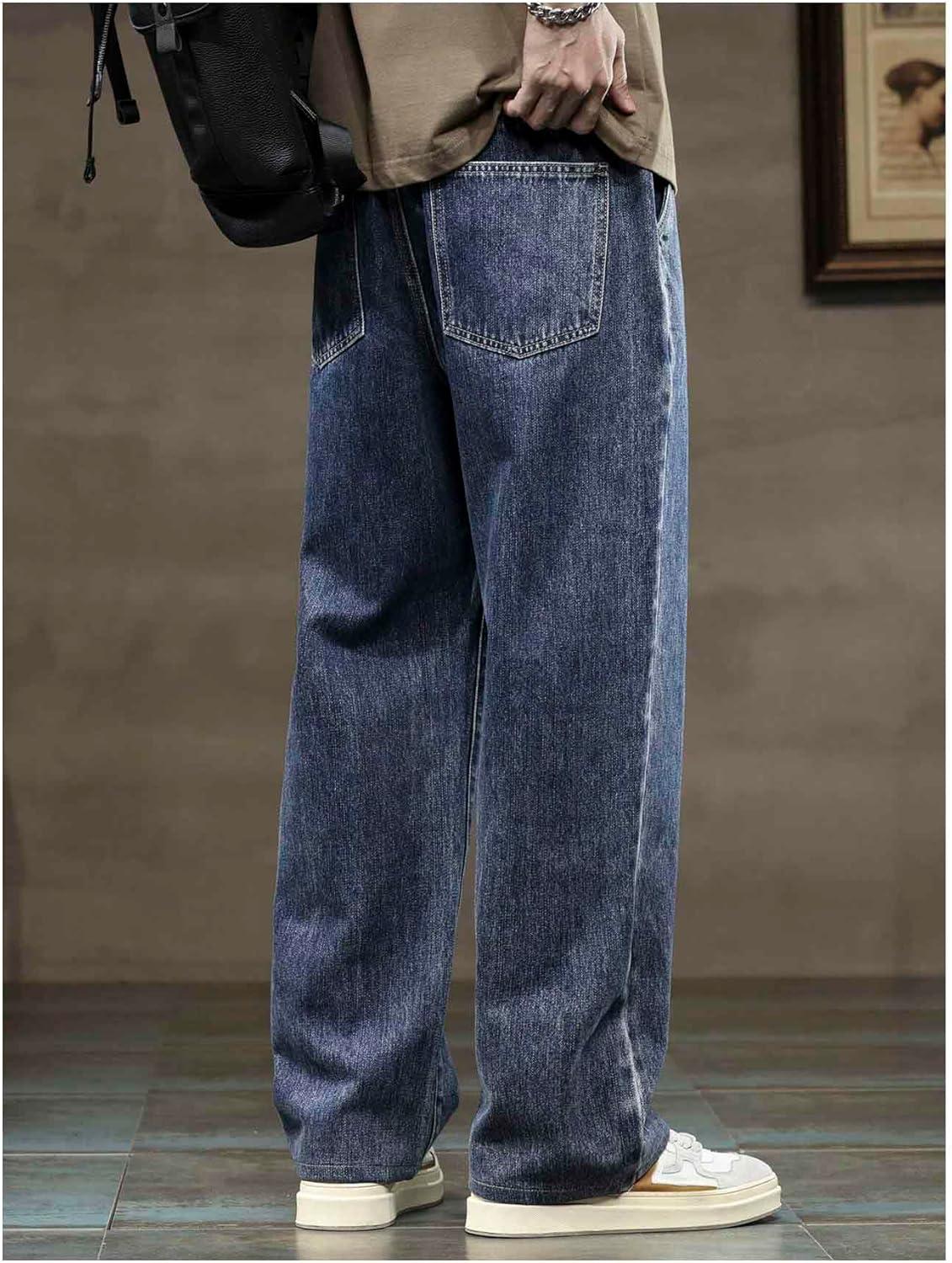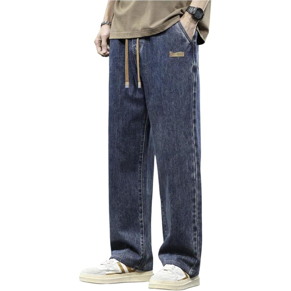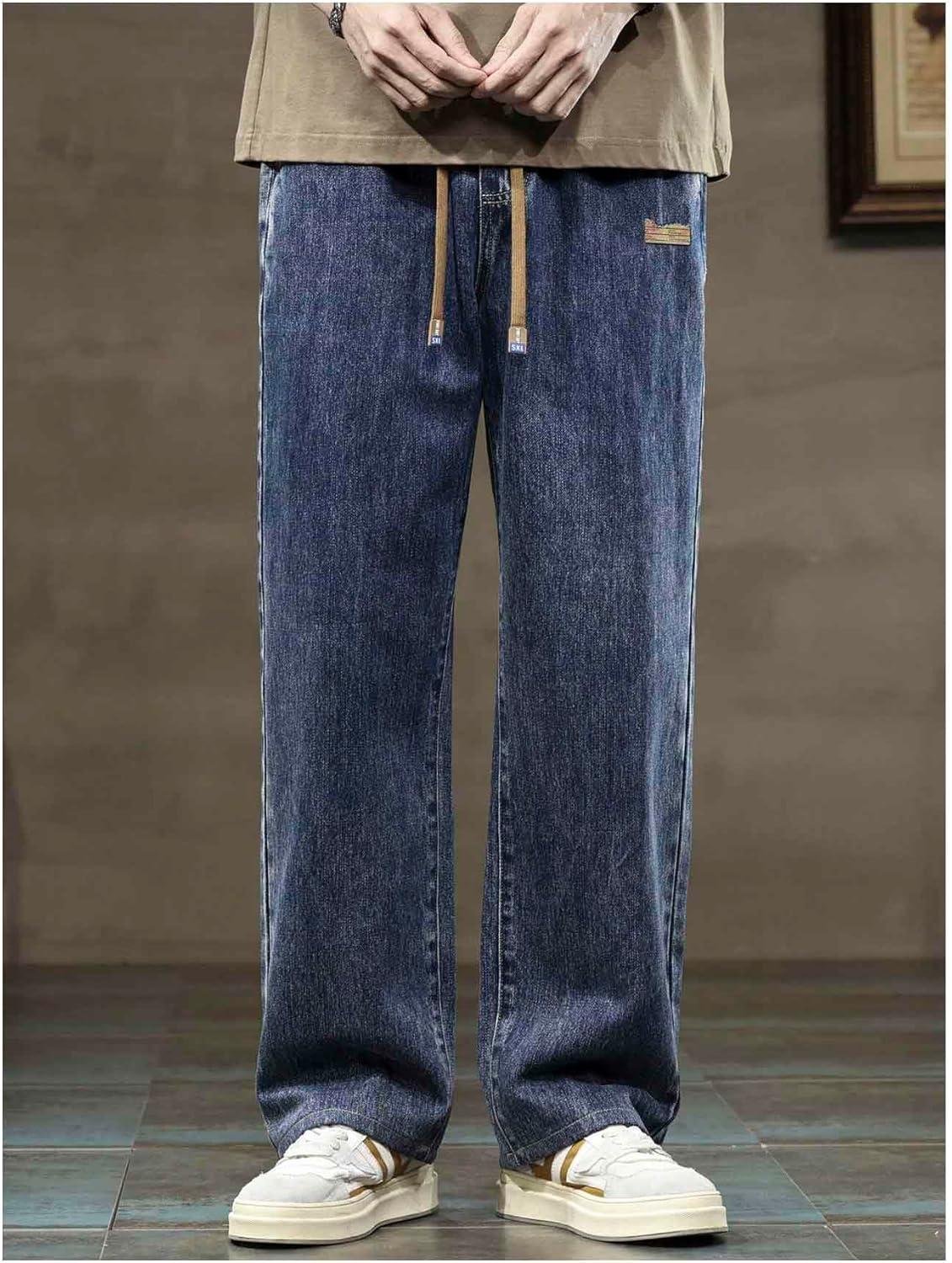 OYOANGLE Men's Vintage Elastic Drawstring Waist Jeans Casual Straight Leg Denim Pants(Dark Wash)