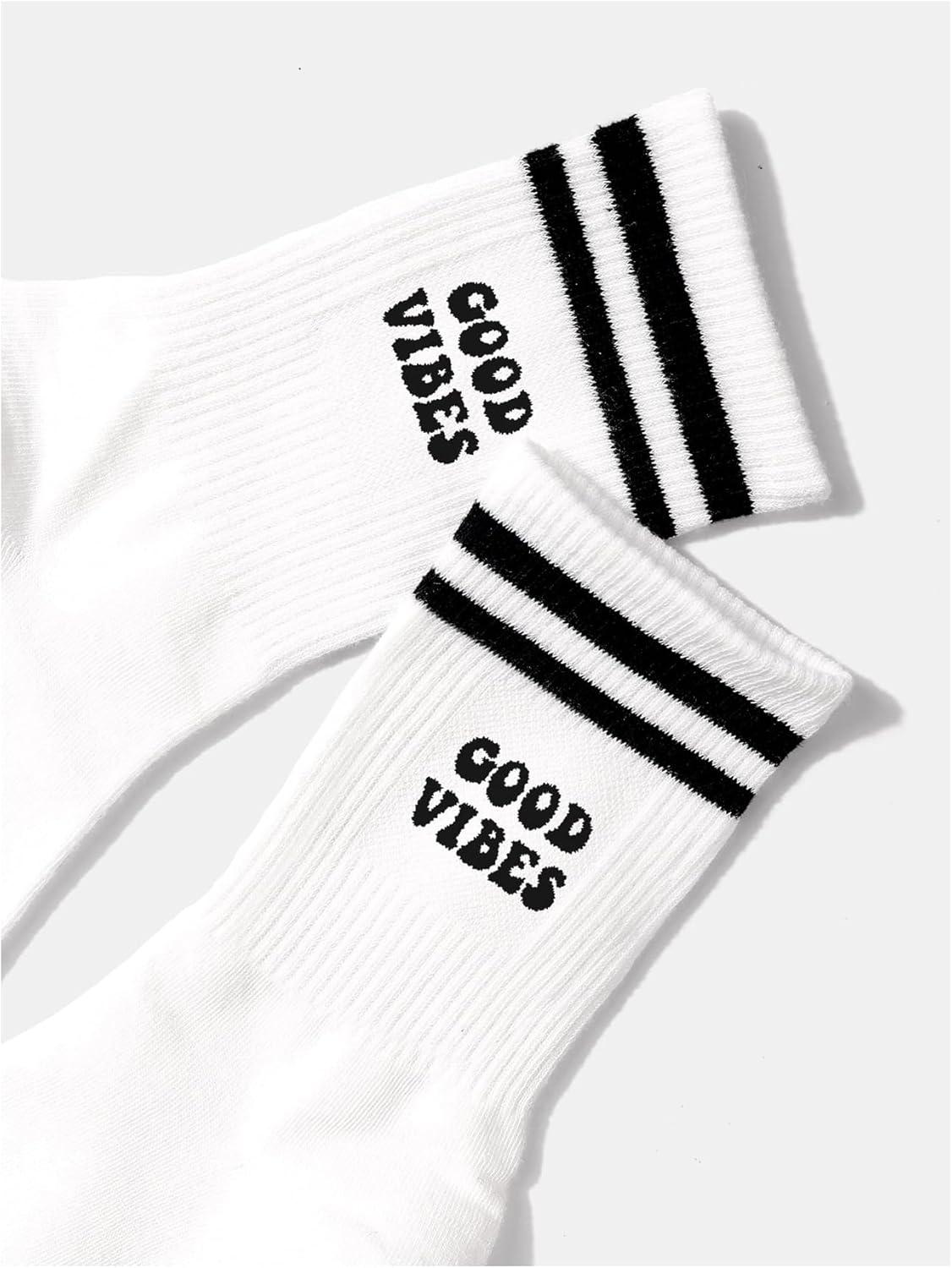 OYOANGLE Women’s 1 Pair Letter Graphic Ribbed Knit Crew Socks Striped Trim Mid Calf Socks(White)