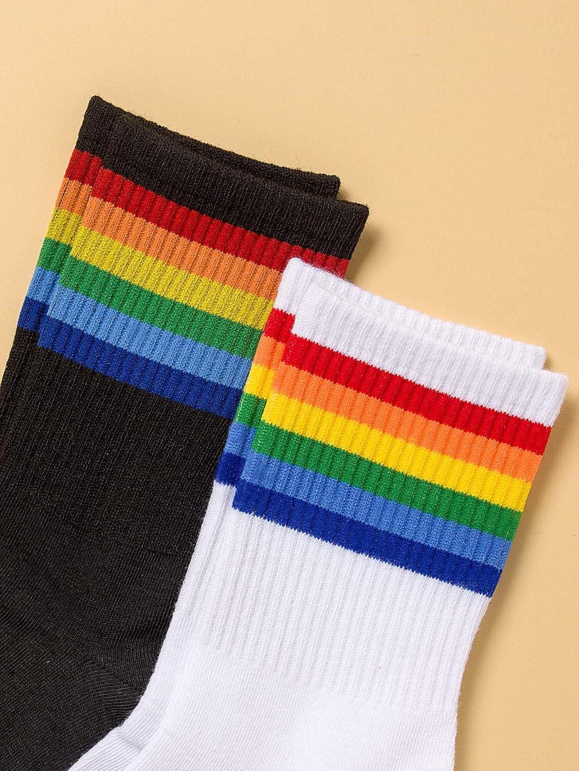 OYOANGLE Women’s 2 Pairs Striped Trim Casual Crew Socks Simple Mid Calf Socks(Black White)