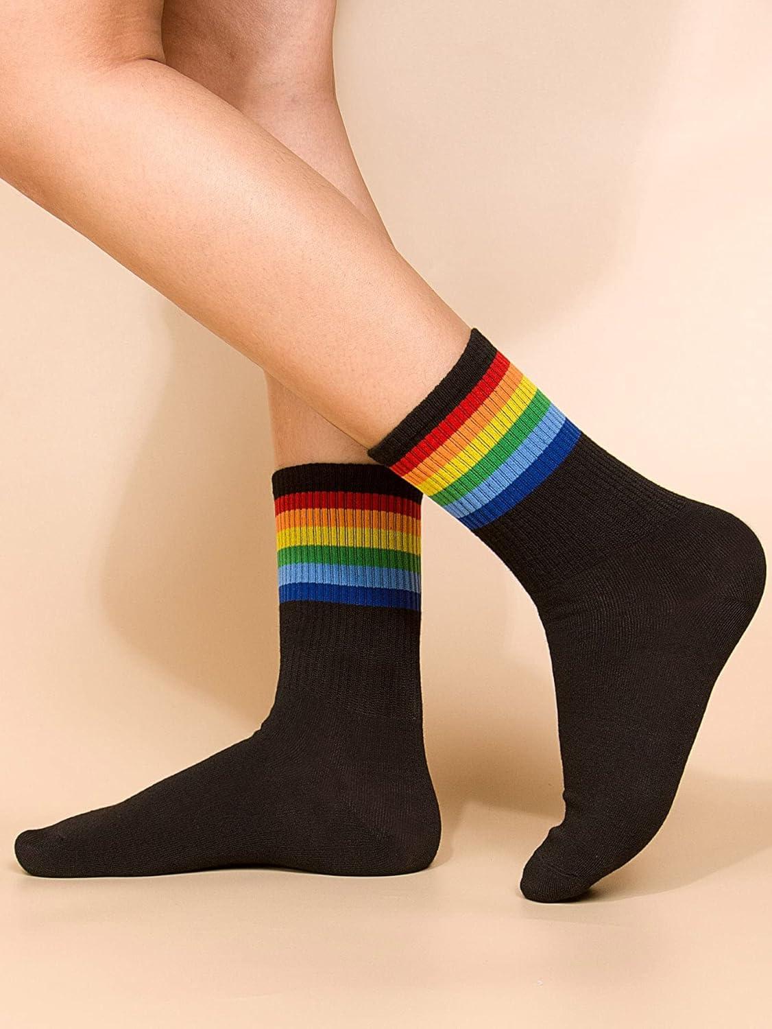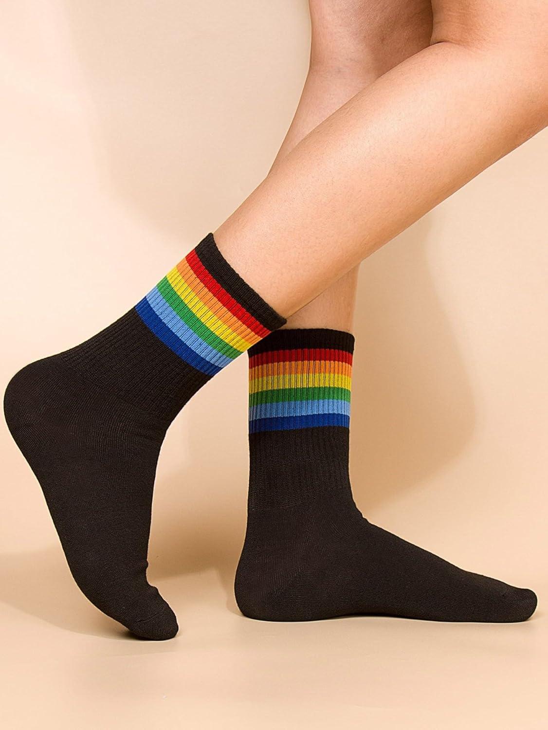OYOANGLE Women’s 2 Pairs Striped Trim Casual Crew Socks Simple Mid Calf Socks(Black Striped)