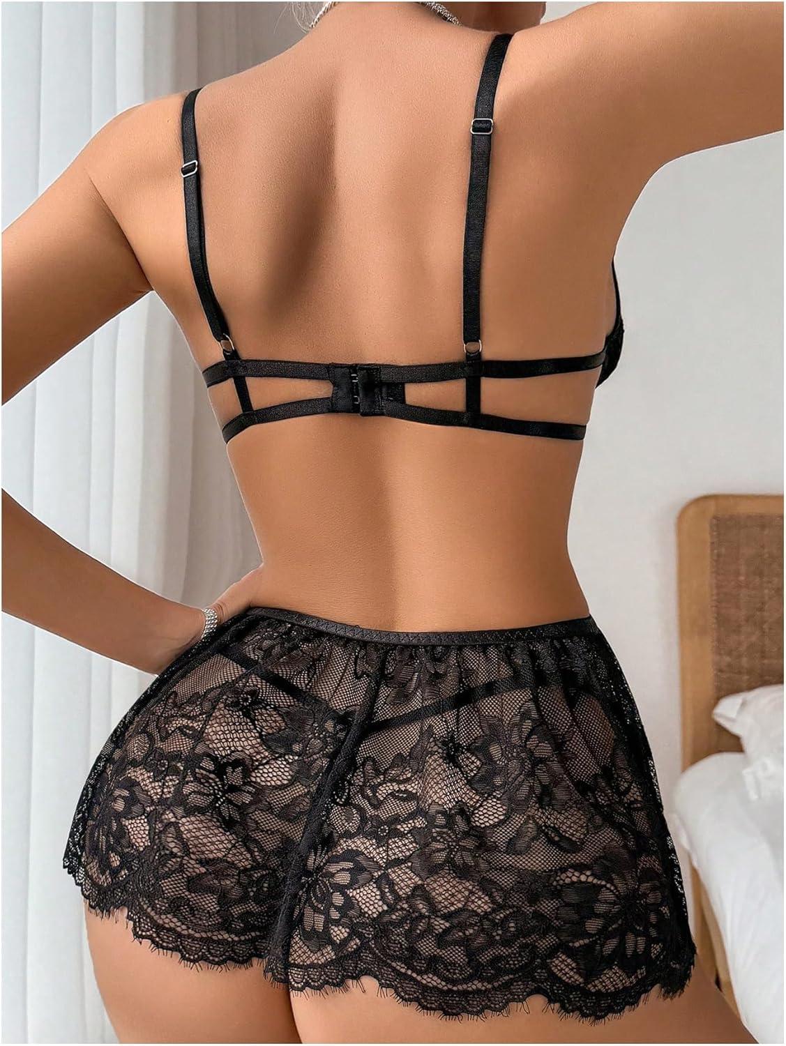 imageOYOANGLE Womens 2 Piece Lingerie Set Lace Sheer Cut Out Backless Chemise Babydoll and Thong SetsBlack