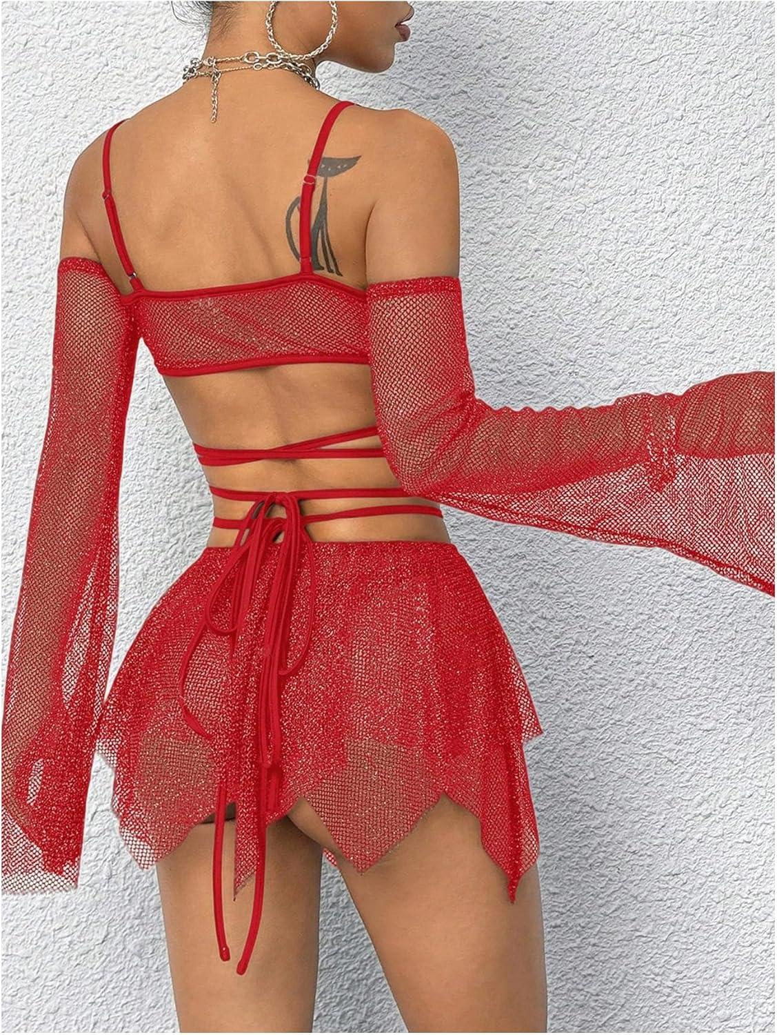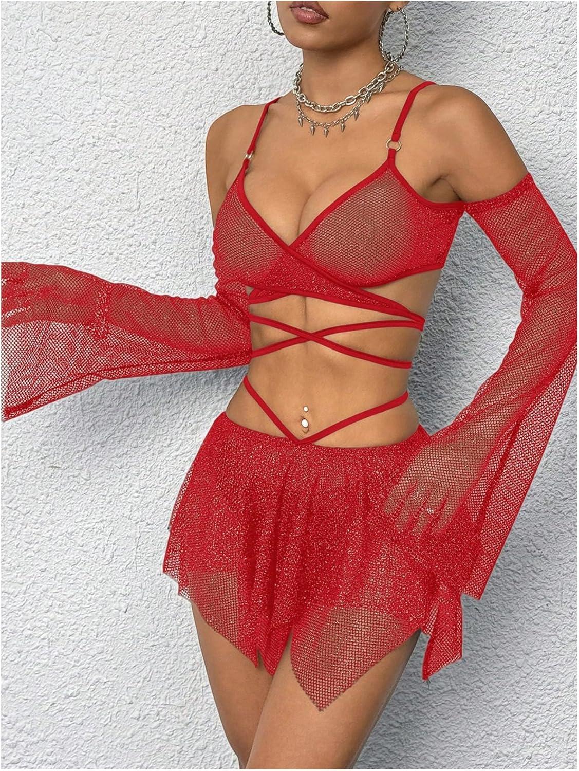 imageOYOANGLE Womens 2 Piece Mesh Sheer Criss Cross Crop Top and Asymmetrical Mini Skirt Party Rave OutfitsRed