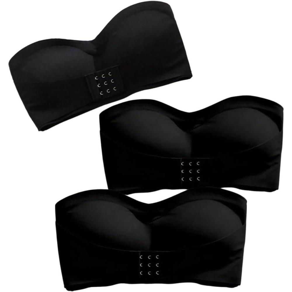OYOANGLE Women’s 3 Pack Front Closure Strapless Bandeau Bras Wireless Push Up Comfy Padded Bralettes(Black)