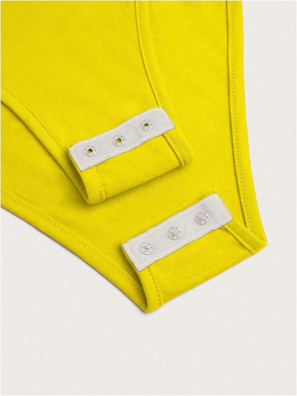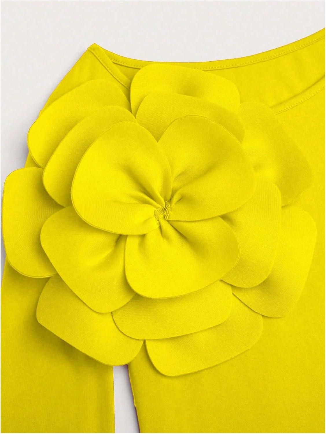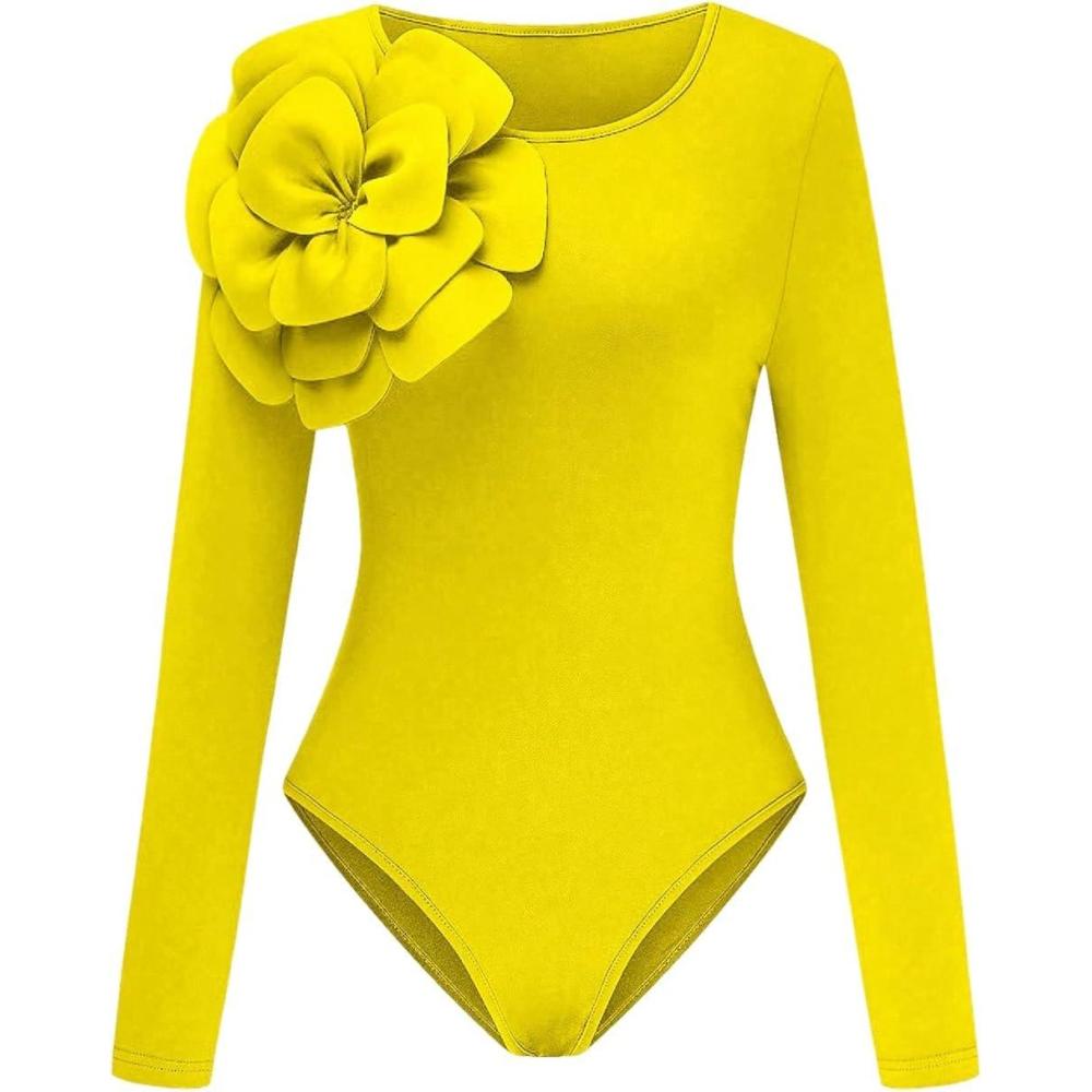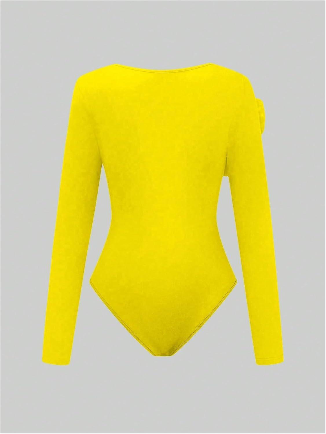 OYOANGLE Women’s 3D Floral Long Sleeve Bodysuit Crew Neck Slimming Tshirt Bodysuits(Yellow)