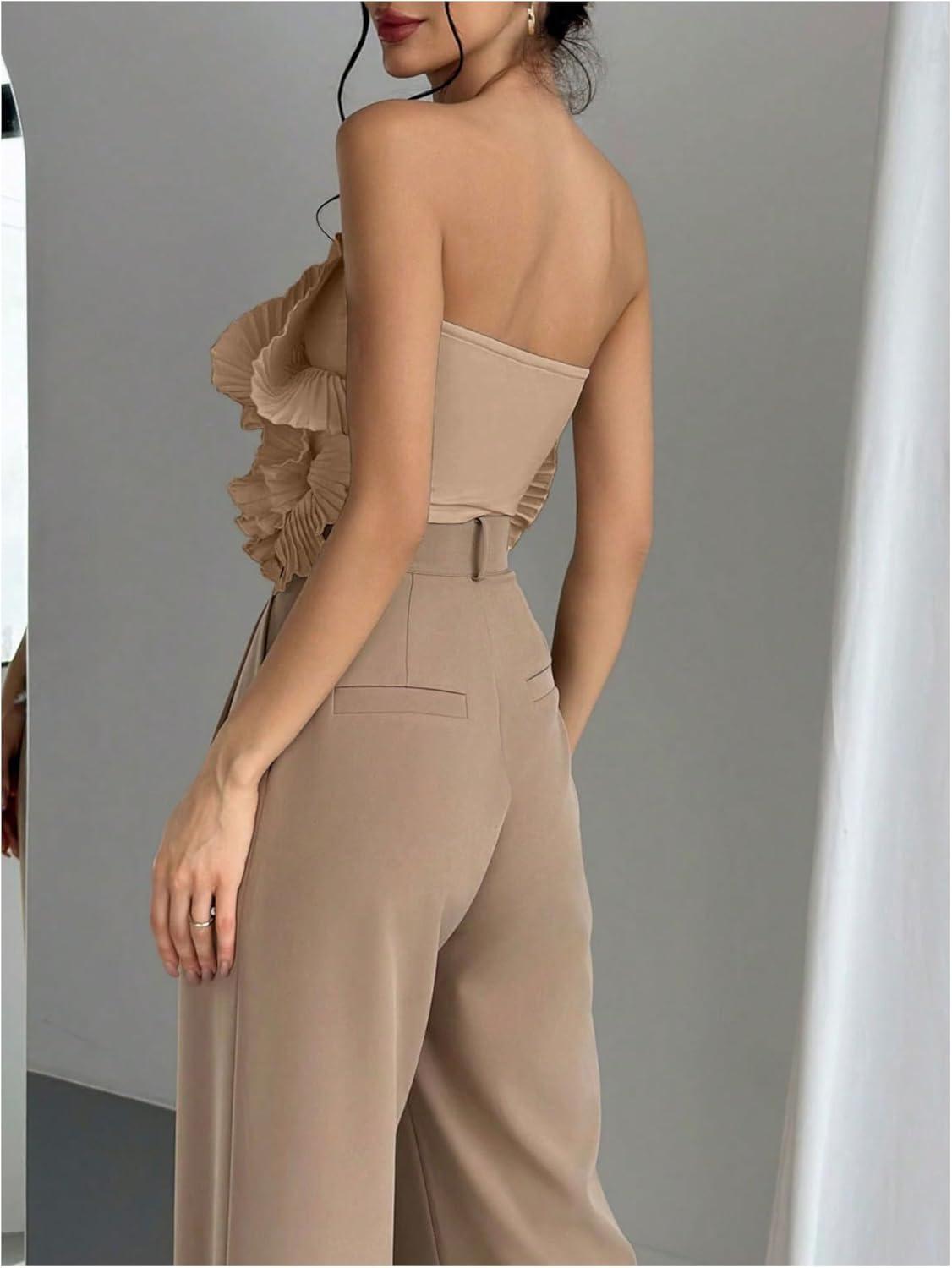 OYOANGLE Women’s 3D Flower Decor Strapless Sleeveless Bandeau Top Slim Fit Solid Cropped Tube Tops(Khaki)