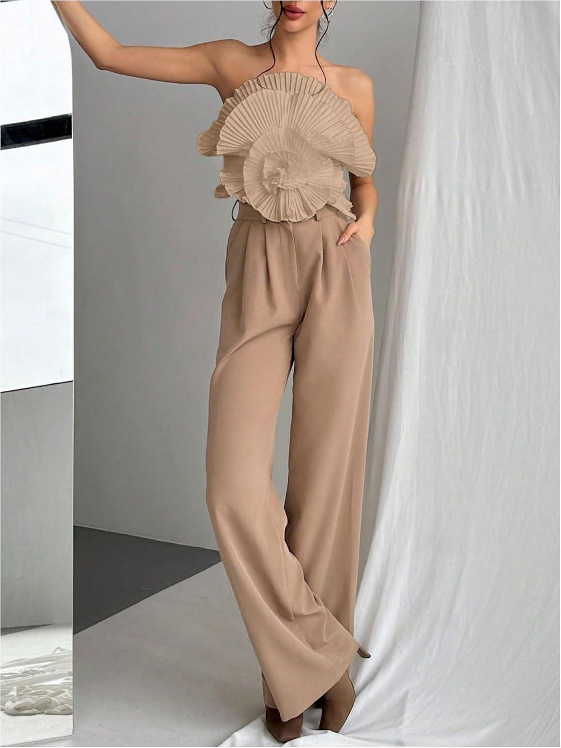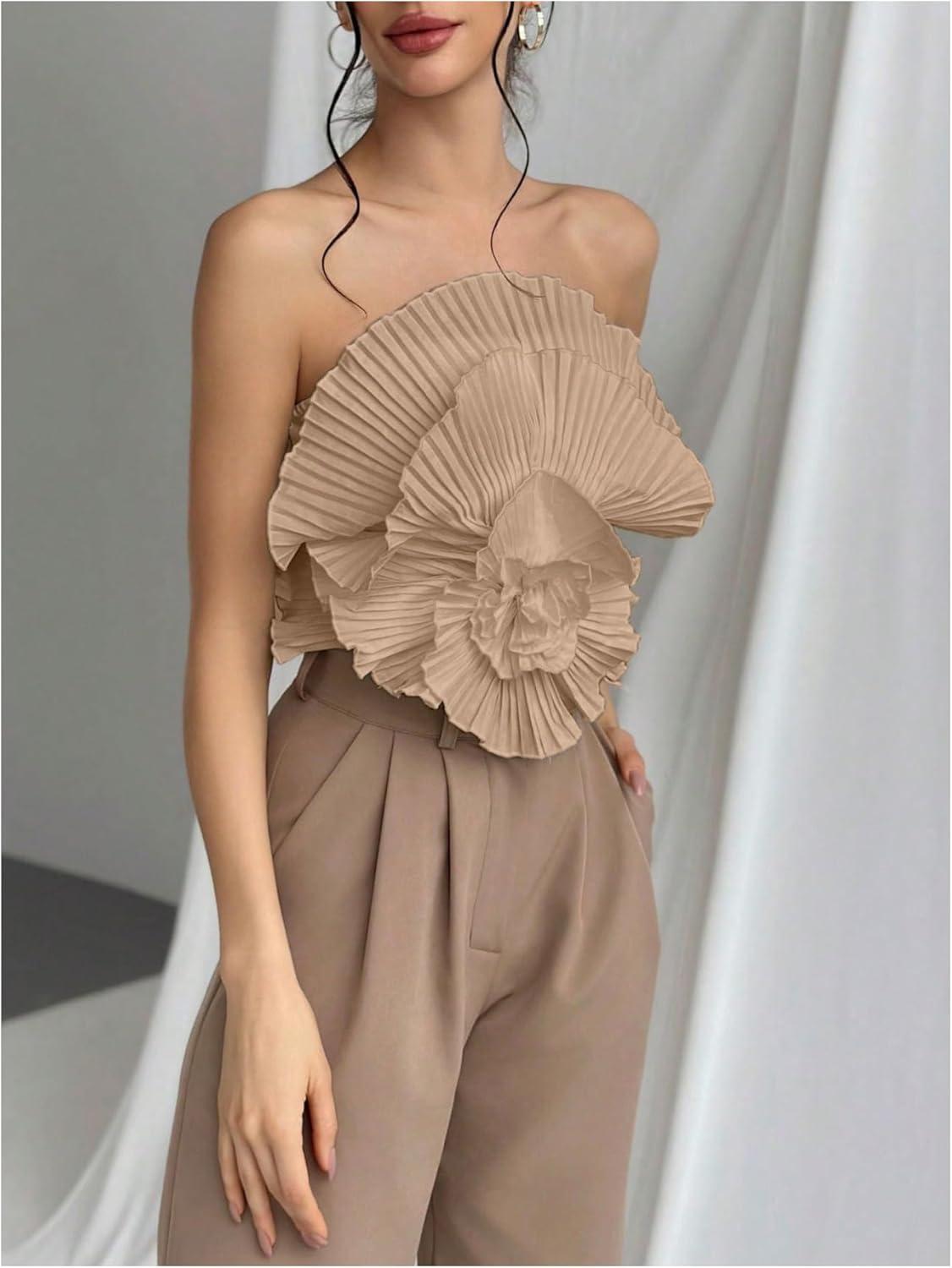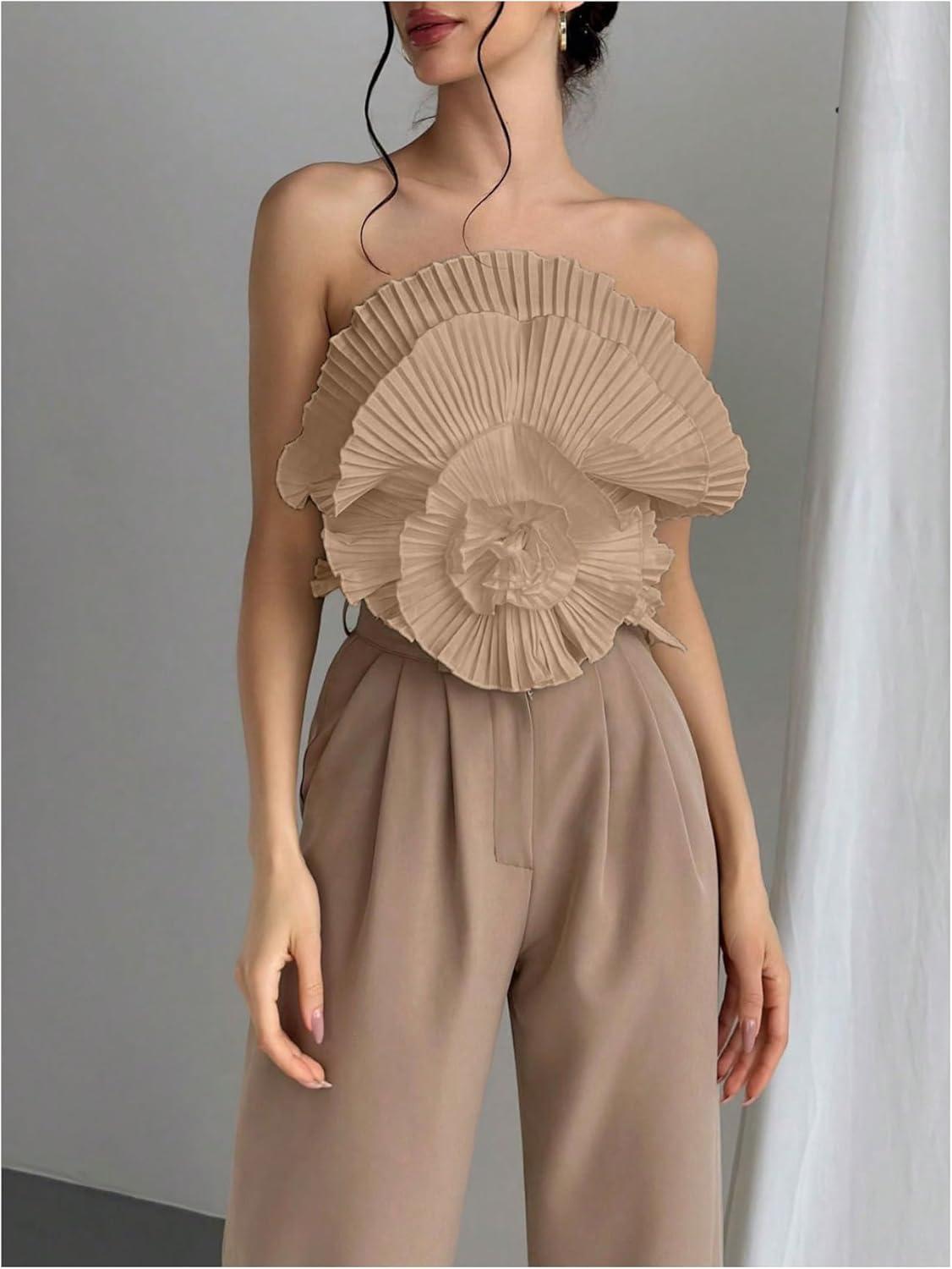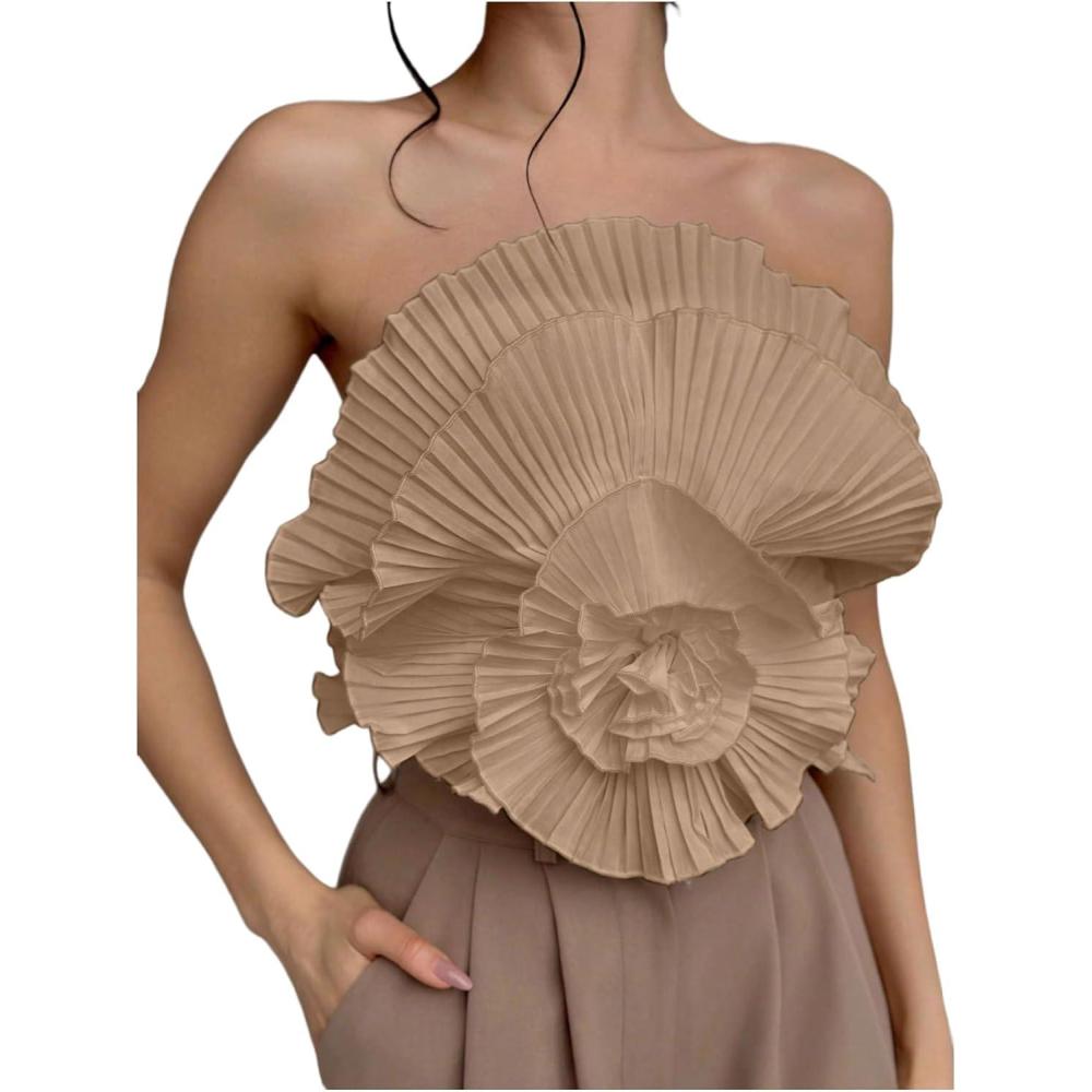 OYOANGLE Women's 3D Flower Decor Strapless Sleeveless Bandeau Top Slim Fit Solid Cropped Tube Tops(Khaki)