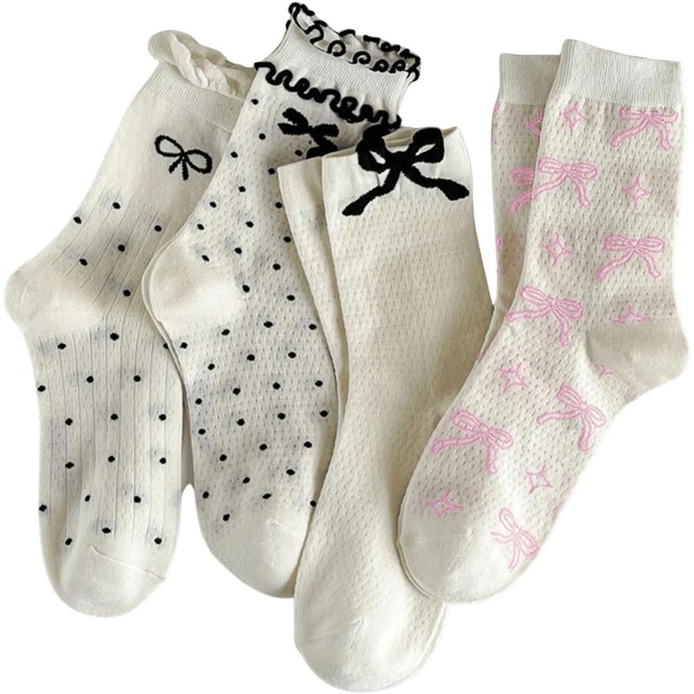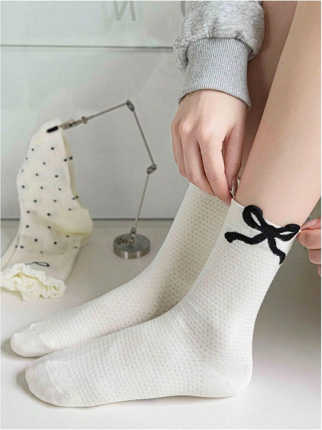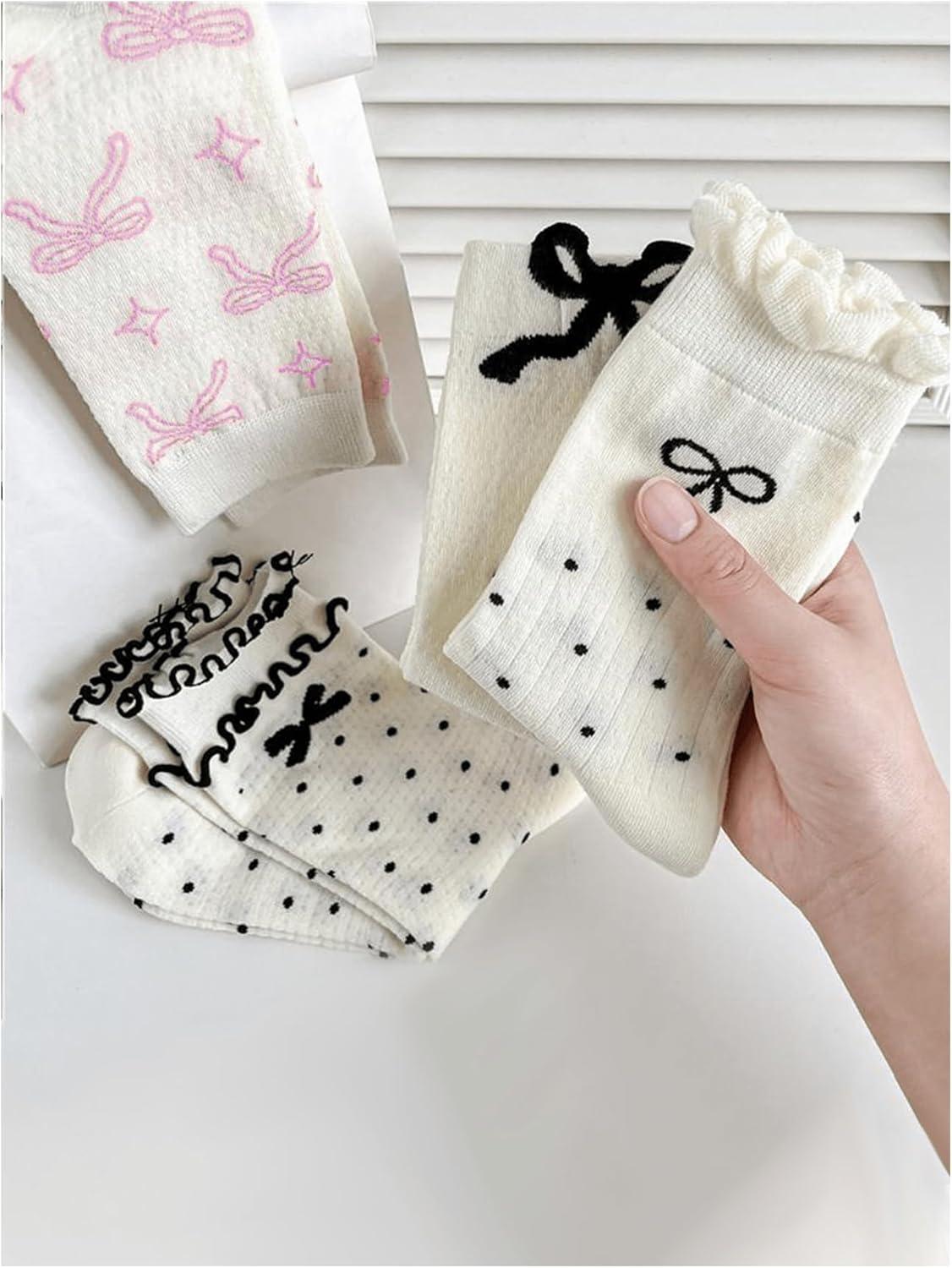 OYOANGLE Women’s 4 Pairs Polka Dots Bow Print Crew Socks Ruffle Lettuce Trim Ankle Socks Cute Novelty Soft Socks(White)