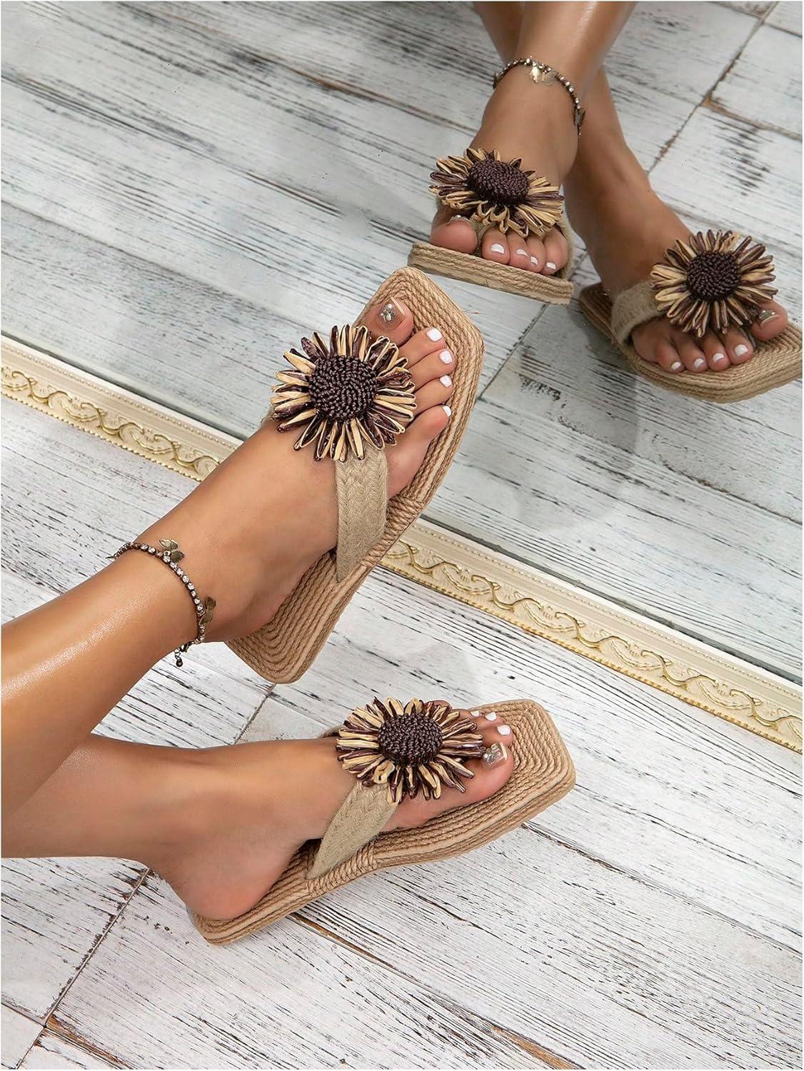 OYOANGLE Women's Boho Floral Decor Straw Flip Flop Sandals Square Open Toe Slide Sandal Slippers(Khaki)