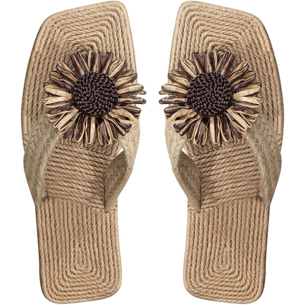 OYOANGLE Women’s Boho Floral Decor Straw Flip Flop Sandals Square Open Toe Slide Sandal Slippers(Khaki)