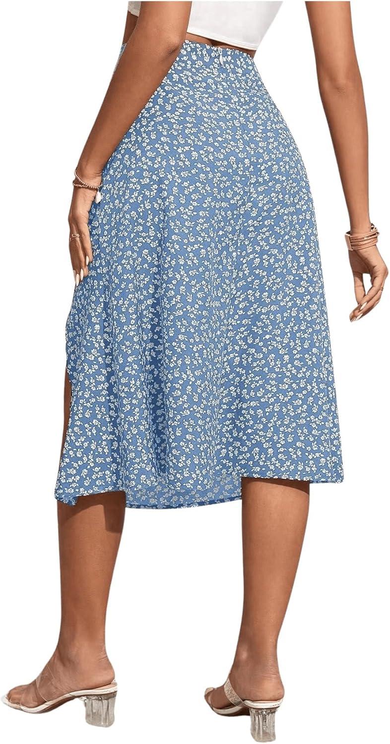 OYOANGLE Women’s Boho Floral Print High Waisted A Line Split Thigh Summer Midi Skirt(Blue)