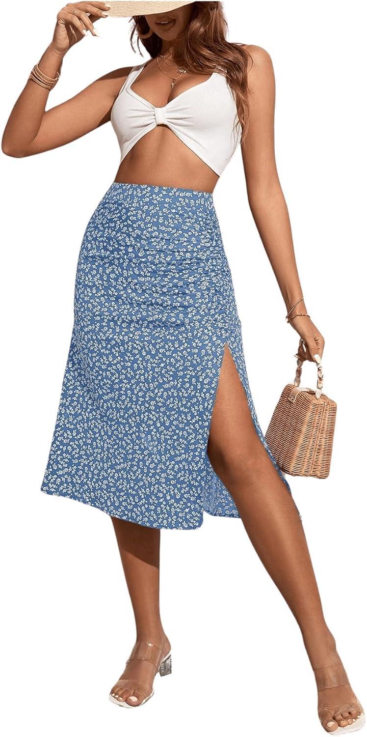 imageOYOANGLE Womens Boho Floral Print High Waisted A Line Split Thigh Summer Midi SkirtBlue