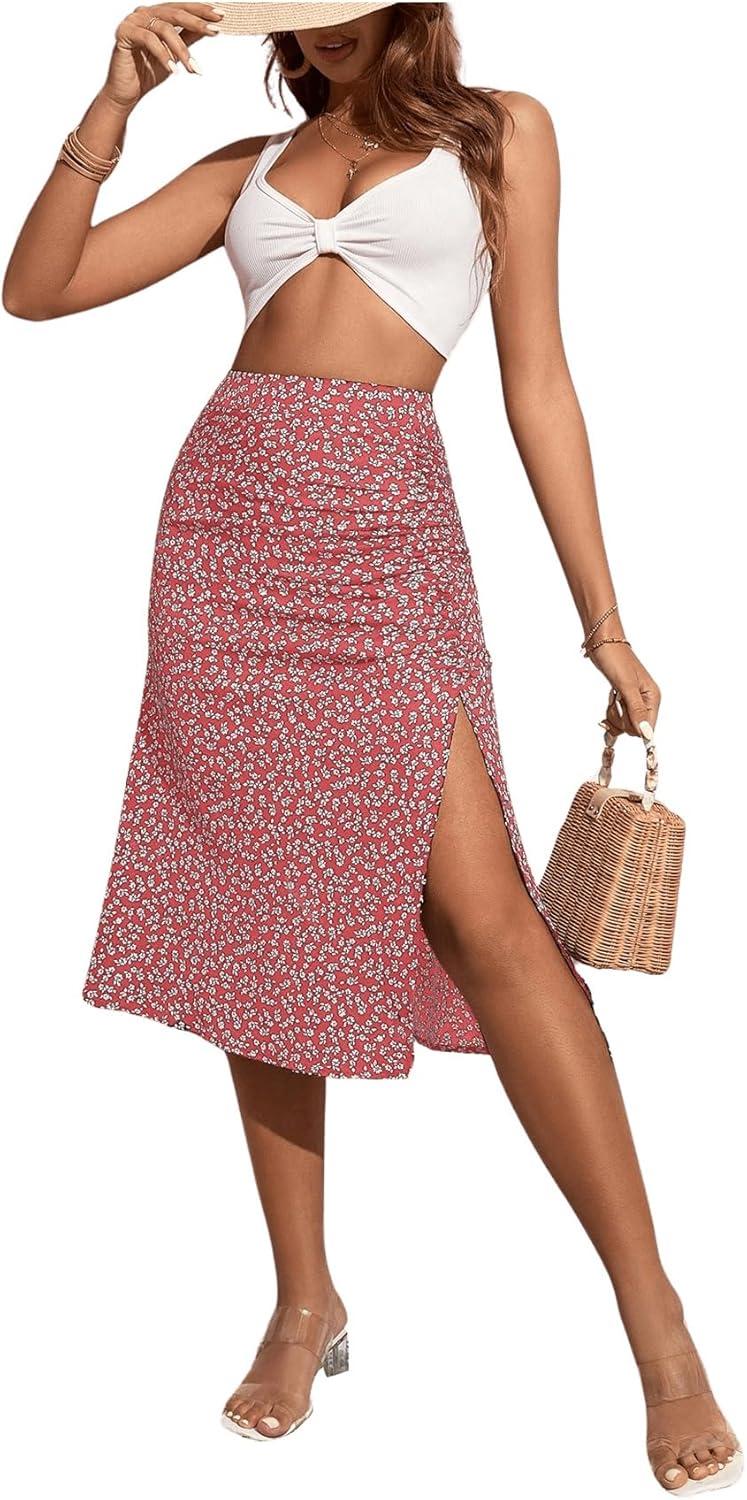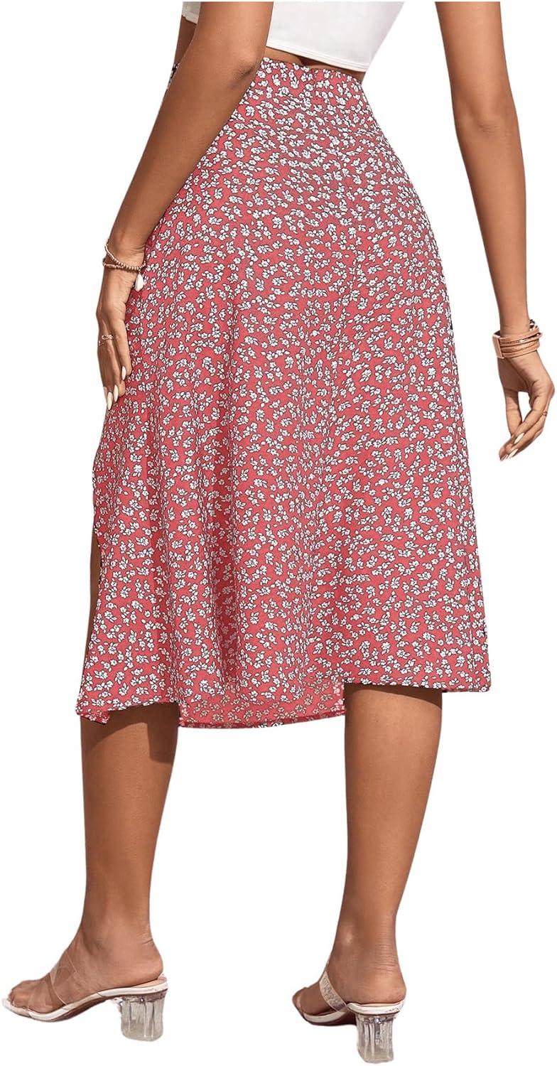 imageOYOANGLE Womens Boho Floral Print High Waisted A Line Split Thigh Summer Midi SkirtRed Floral