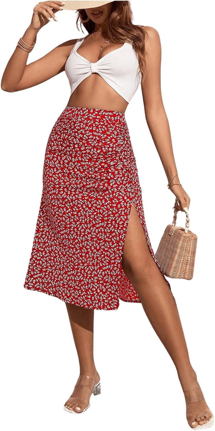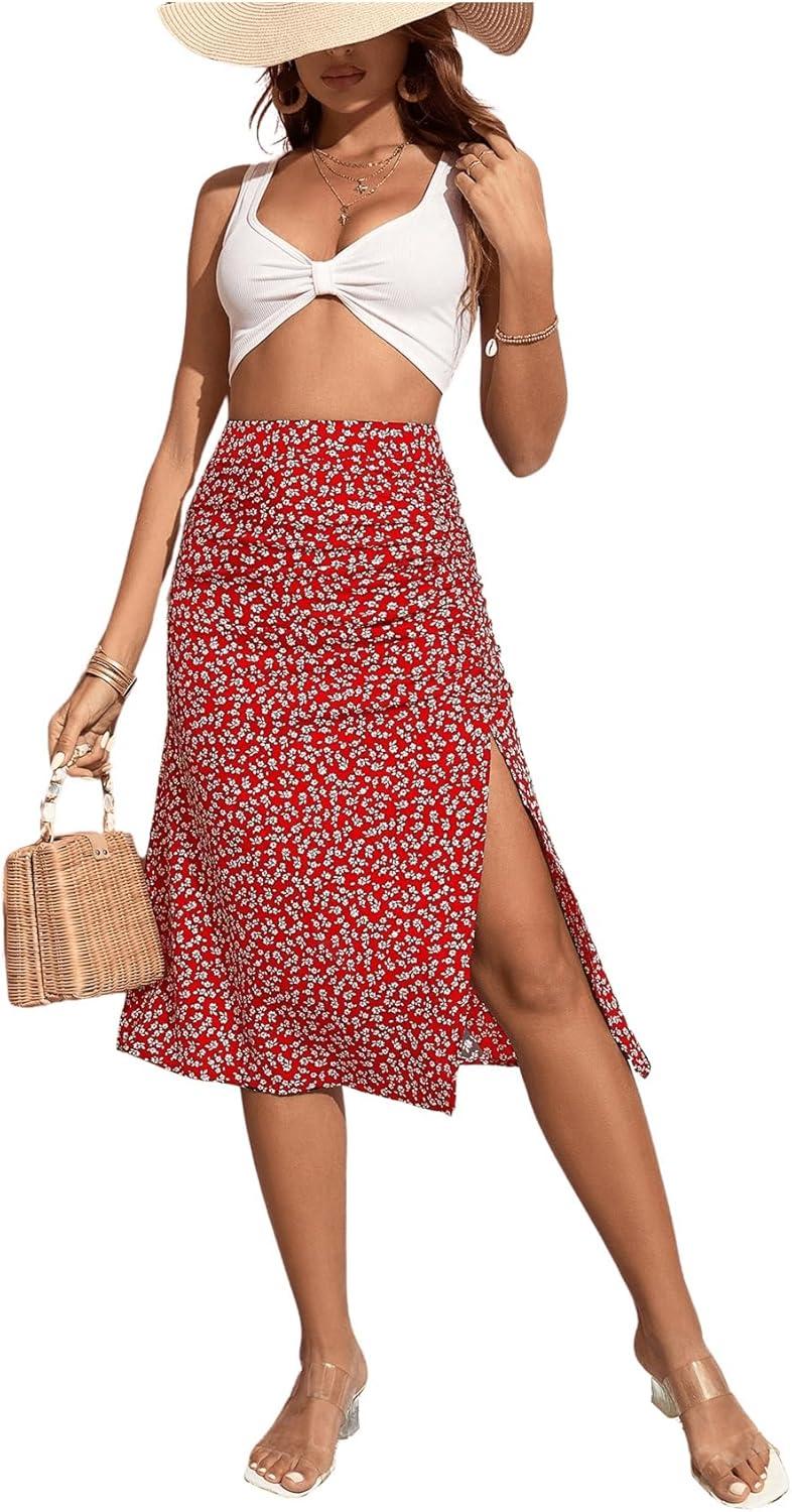 imageOYOANGLE Womens Boho Floral Print High Waisted A Line Split Thigh Summer Midi SkirtRed Floral