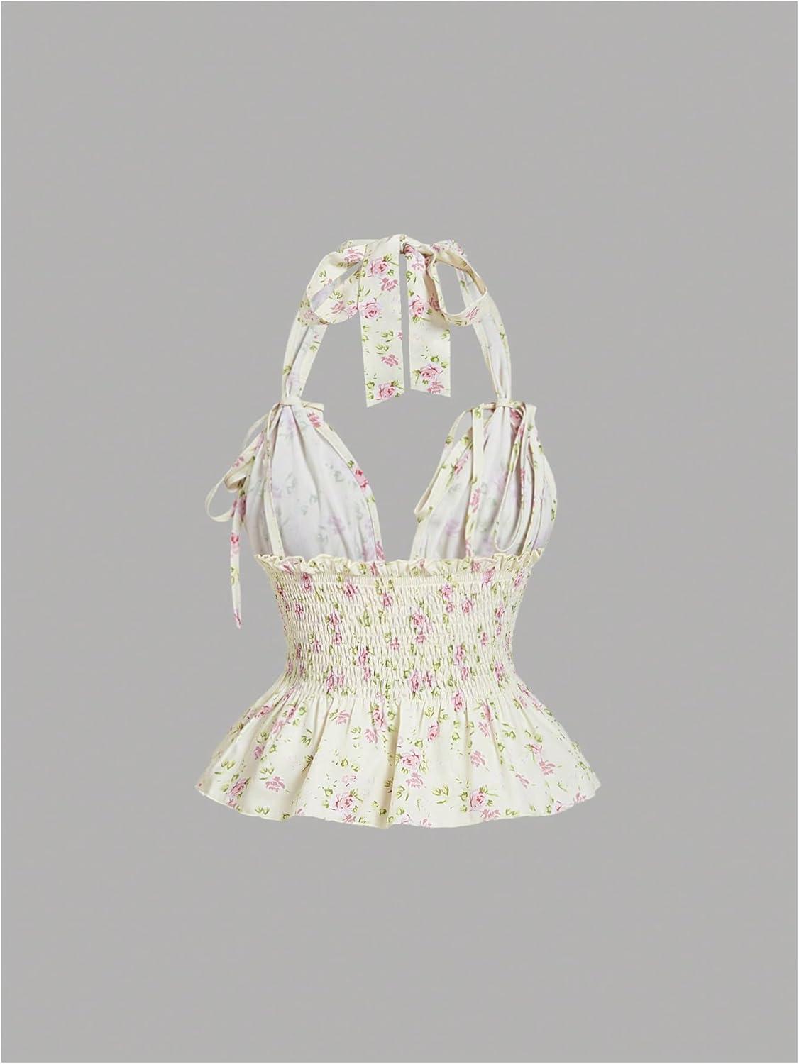 OYOANGLE Women’s Boho Floral Print Tie Backless Halter Cami Tops Sleeveless Shirred Ruffle Peplum Top(Beige)