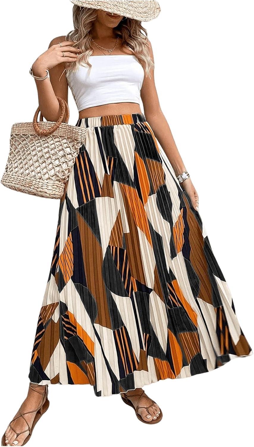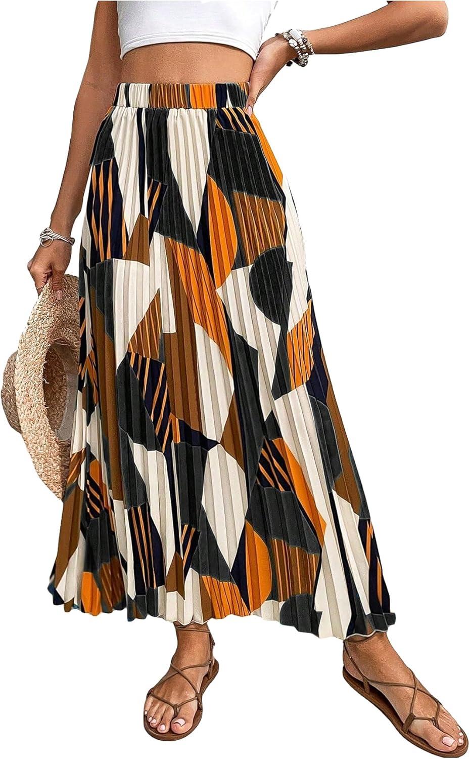 imageOYOANGLE Womens Boho Geo Print Elastic High Waist Flowy Pleated Maxi Skirt Vacation SkirtsBlack Orange