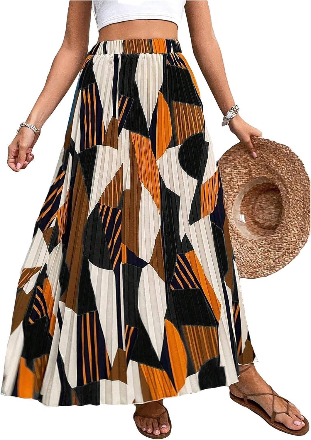 OYOANGLE Women’s Boho Geo Print Elastic High Waist Flowy Pleated Maxi Skirt Vacation Skirts(Black Orange)