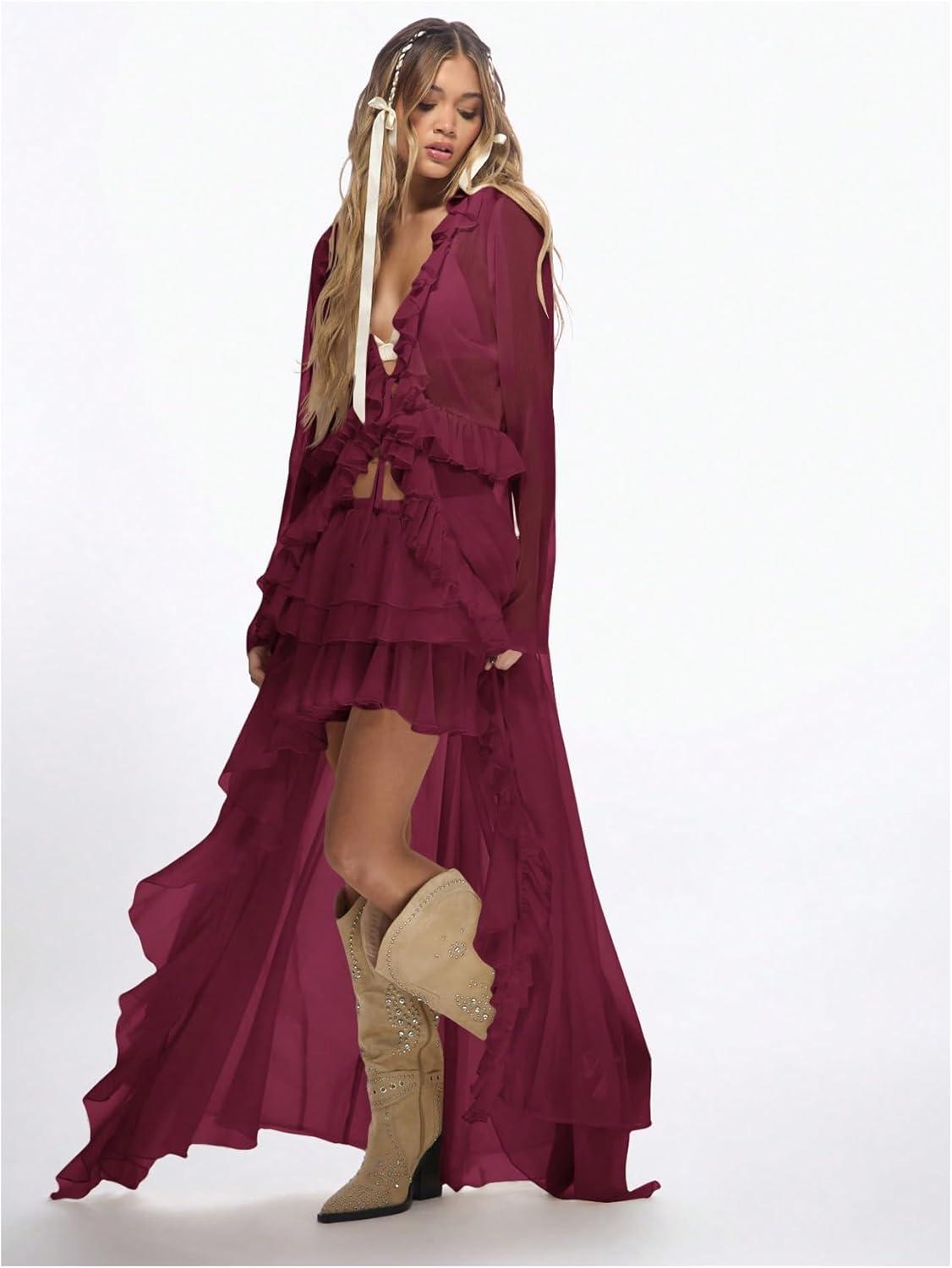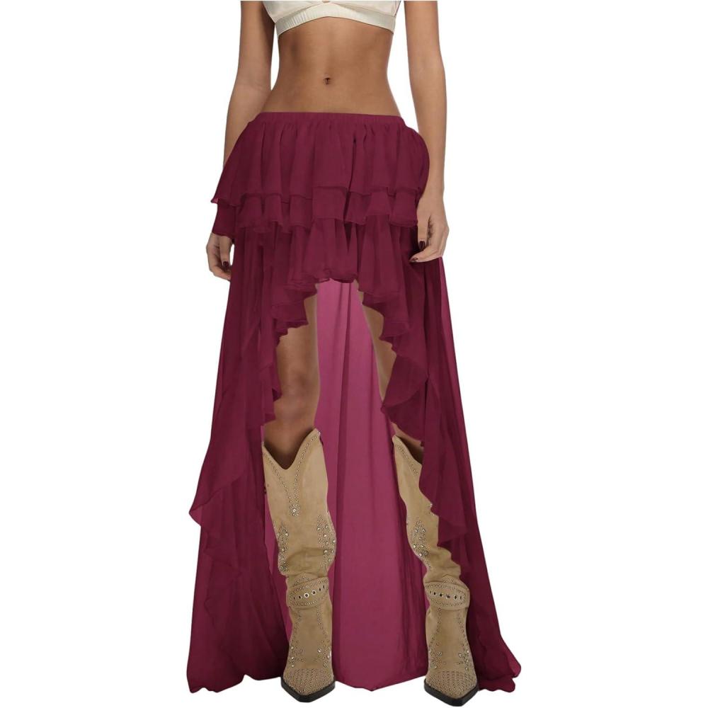 OYOANGLE Women’s Boho Layered Ruffle Chiffon Maxi Skirt Y2K Elastic Cowgirl Western Asymmetrical Skirts(Burgundy)