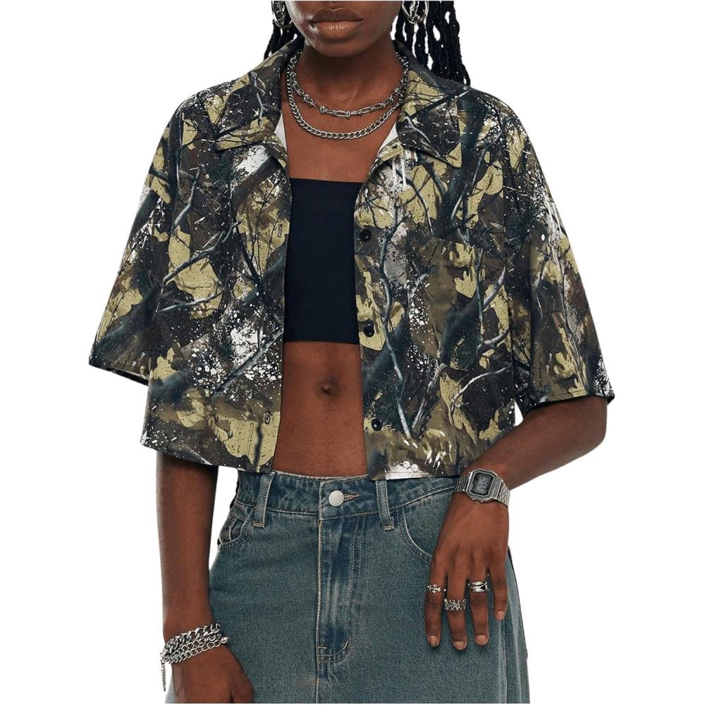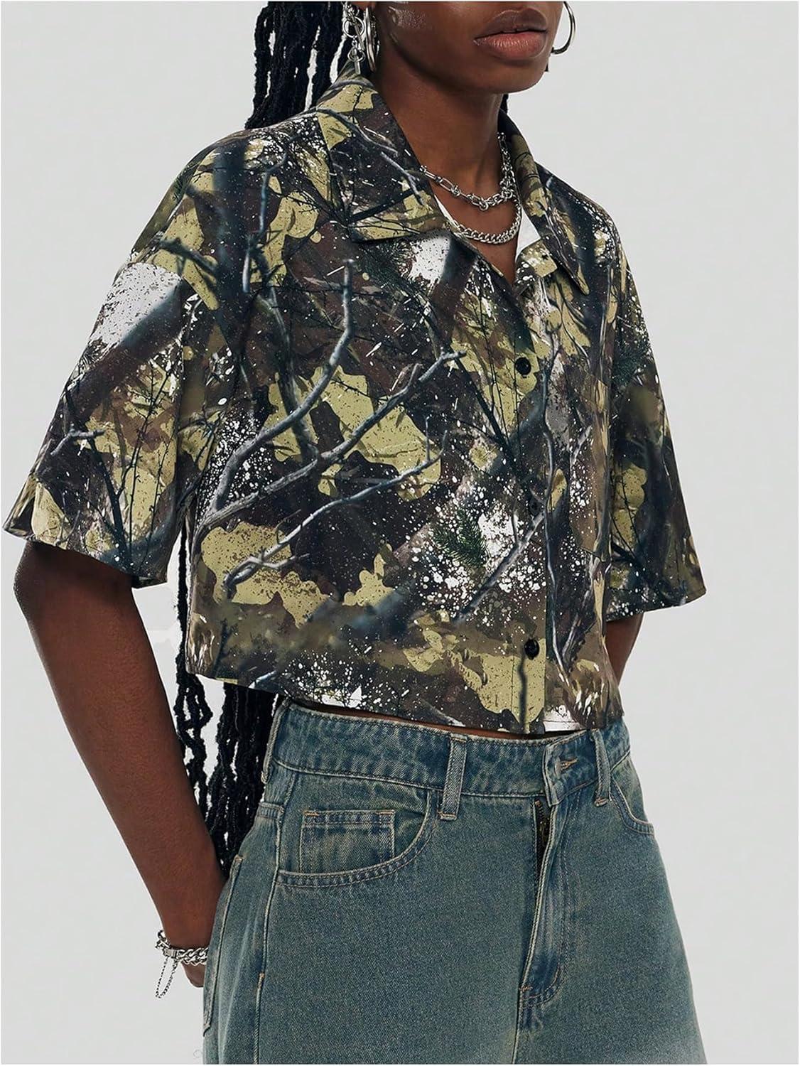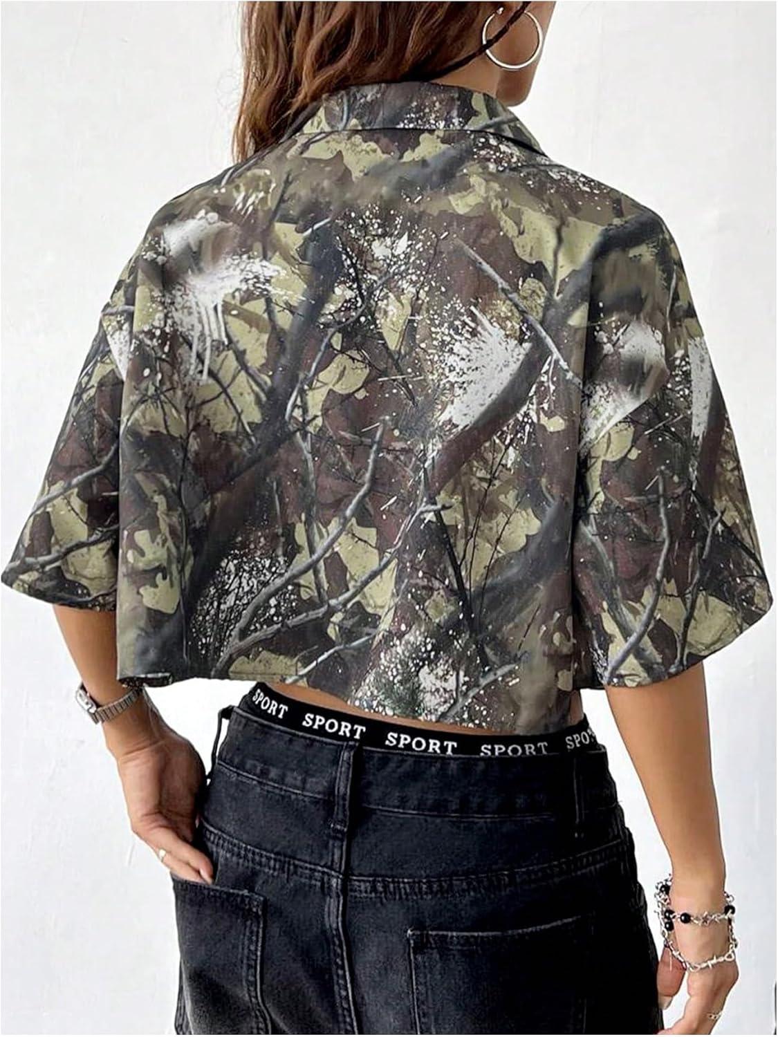 OYOANGLE Women's Button Down Camo Print Blouses Collared Short Sleeve Crop Shirts Top Streetwear(Green)