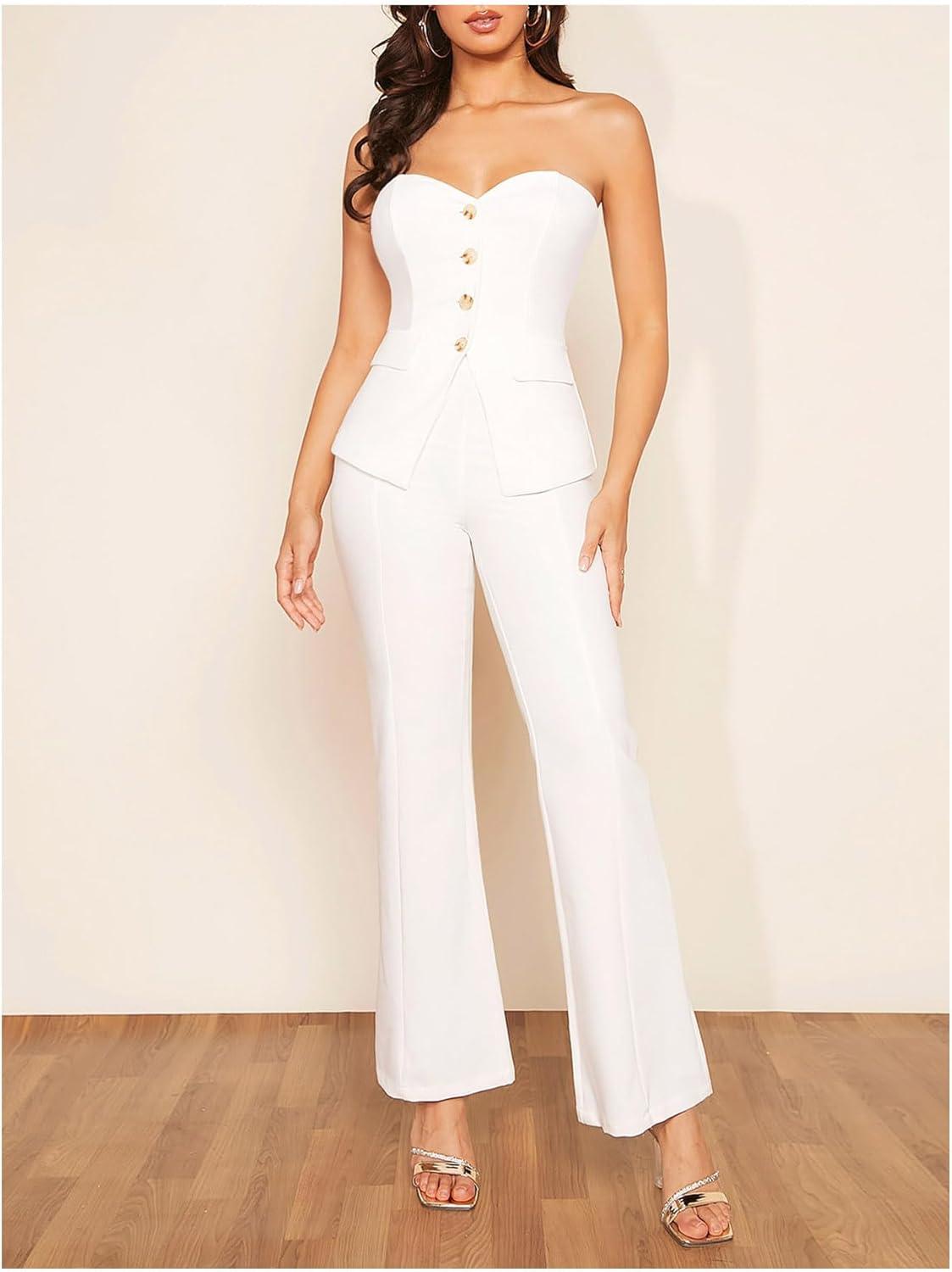 imageOYOANGLE Womens Button Front Split Hem Strapless Tube Top Elegant Workwear Tank TopsWhite
