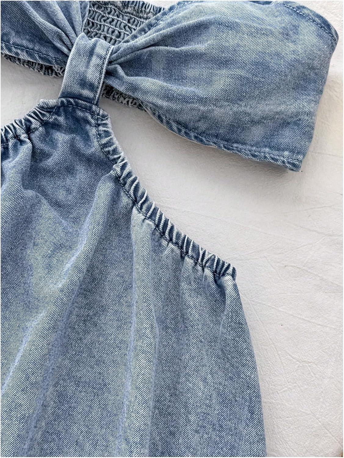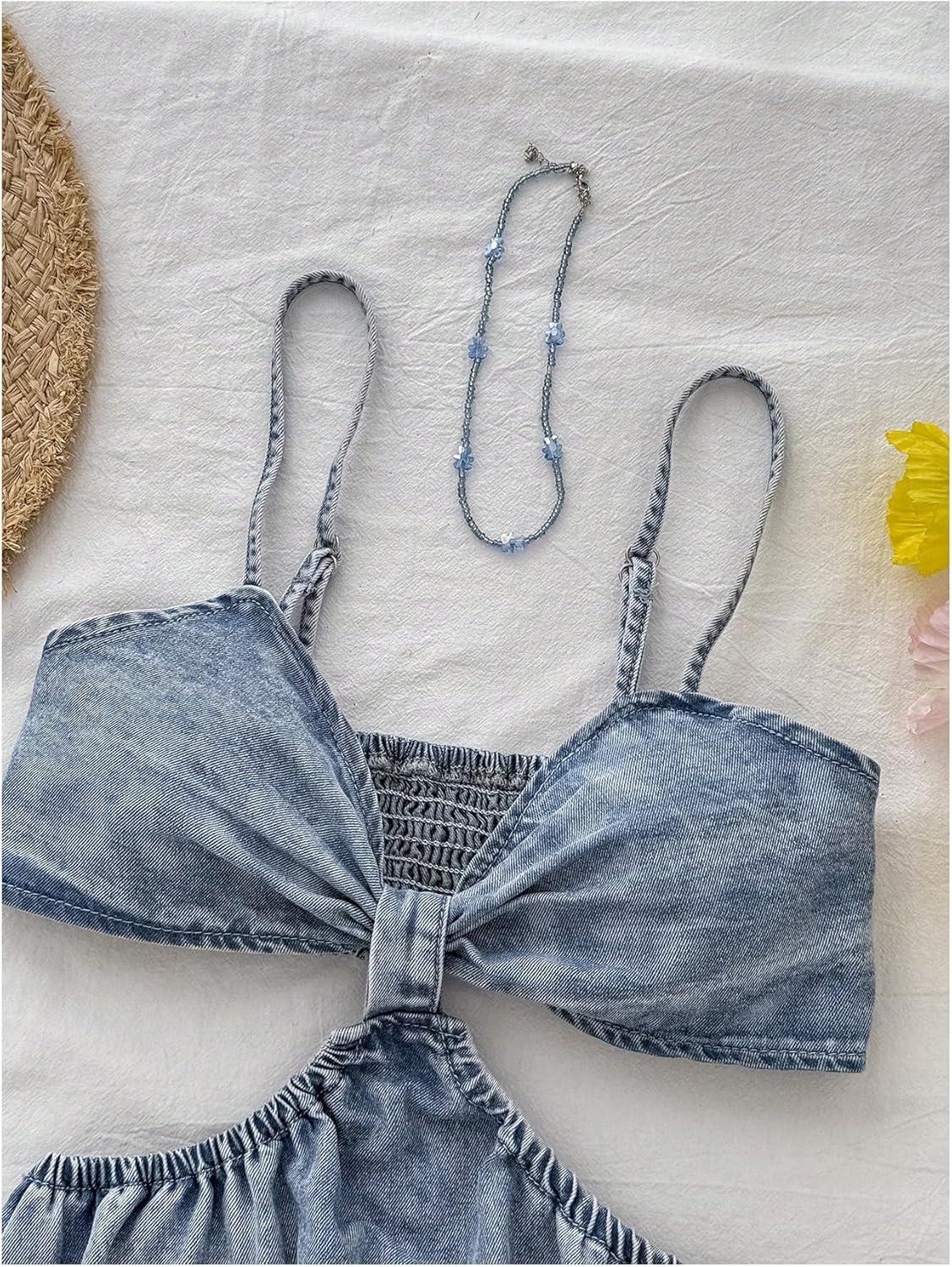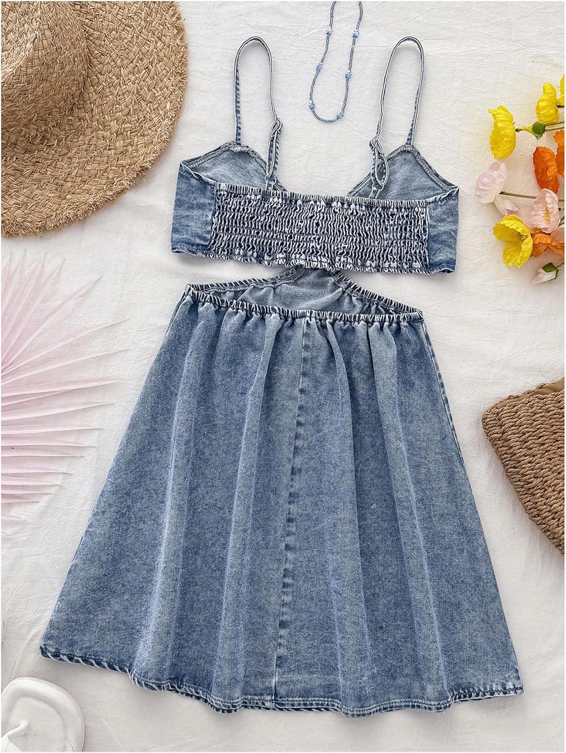 OYOANGLE Women’s Cut Out A Line Denim Dress Spaghetti Strap V Neck Summer Short Jean Dresses(Light Wash)