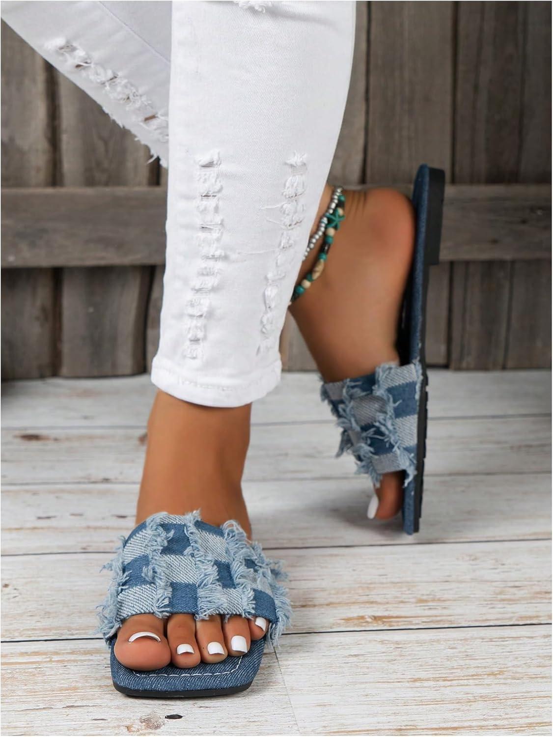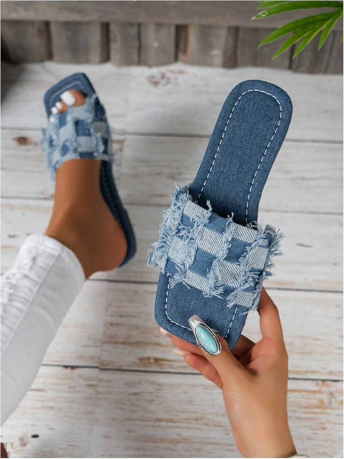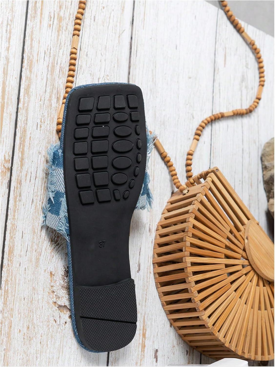 OYOANGLE Women's Denim Plaid Square Toe Flats Open Toe Non-Slip Slide Sandals Vintage Jean Slippers(Light Blue)
