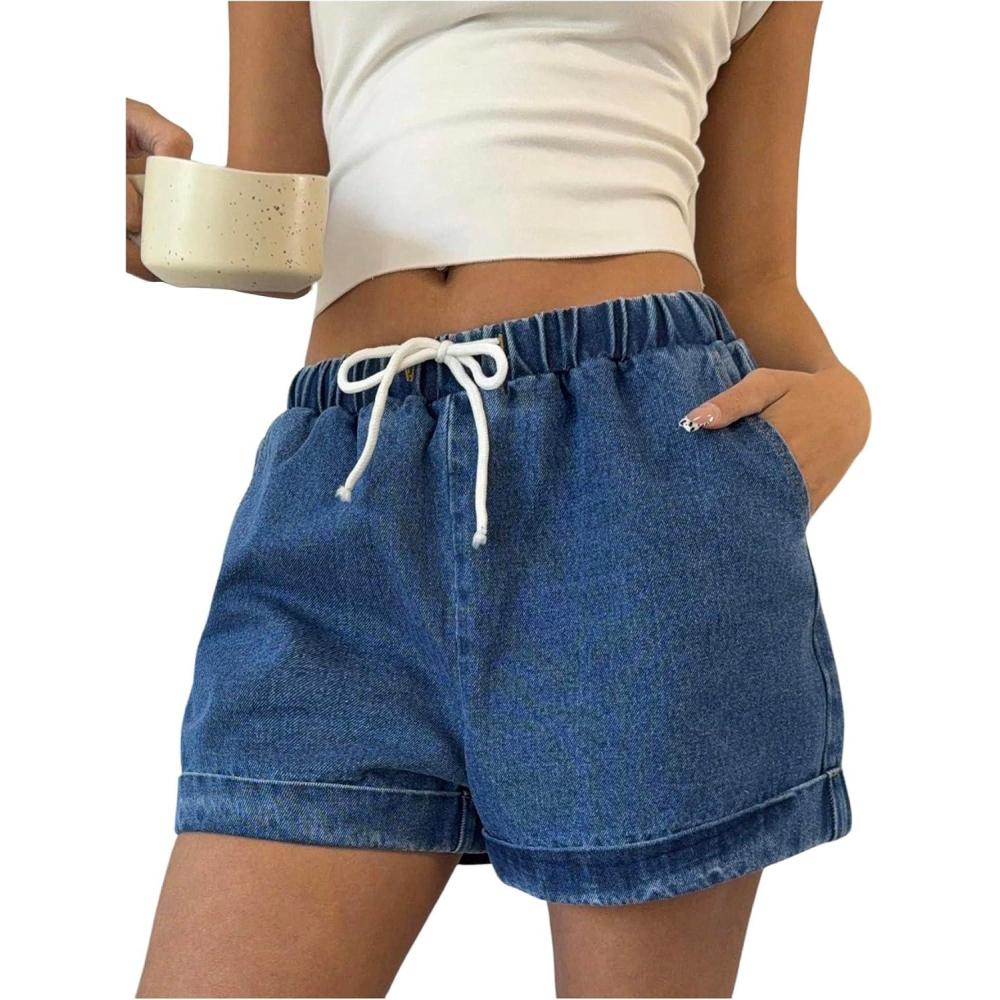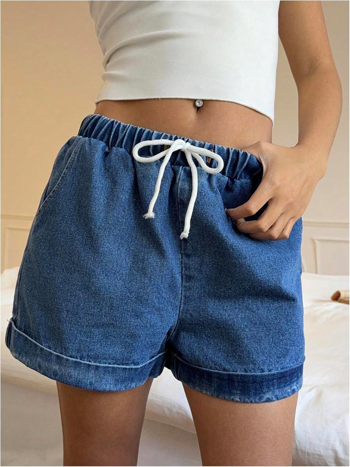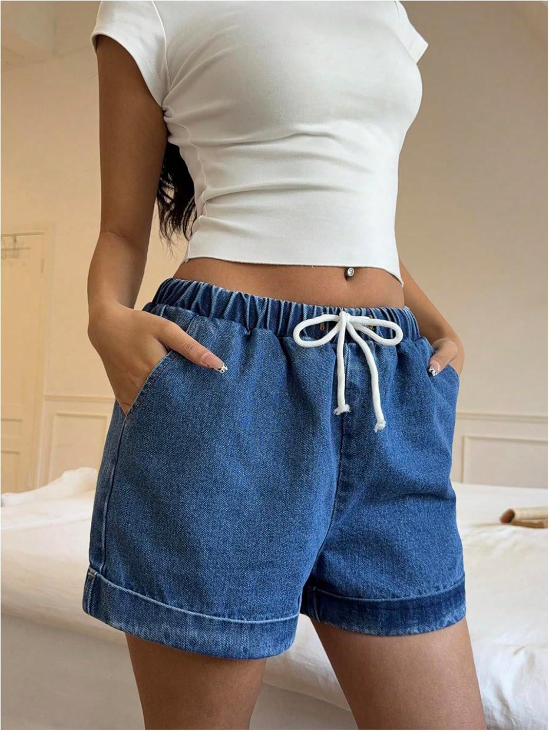 OYOANGLE Women's Drawstring Elastic Waist Denim Shorts Straight Leg Casual Jean Shorts(Blue)