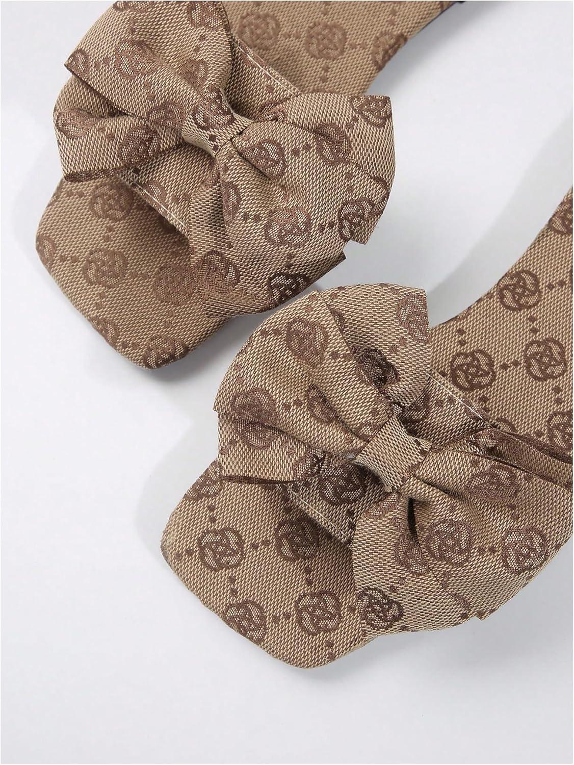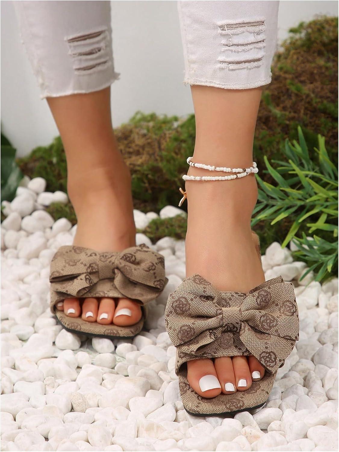 OYOANGLE Women's Floral Print Bow Sandals Square Open Toe Slip On Flat Sandals Elegant Outdoor Slippers(Brown)