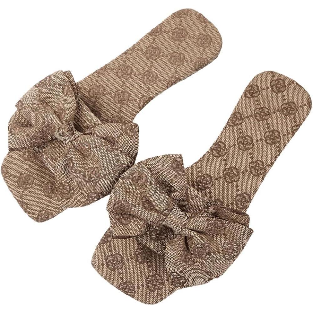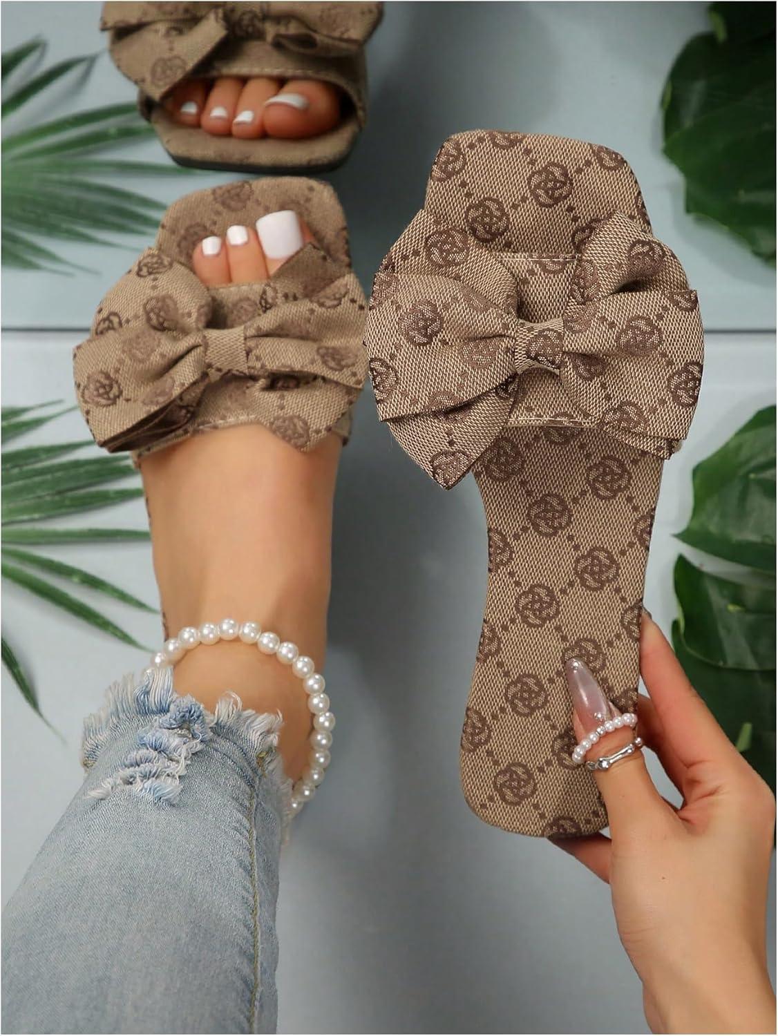 OYOANGLE Women’s Floral Print Bow Sandals Square Open Toe Slip On Flat Sandals Elegant Outdoor Slippers(Brown)